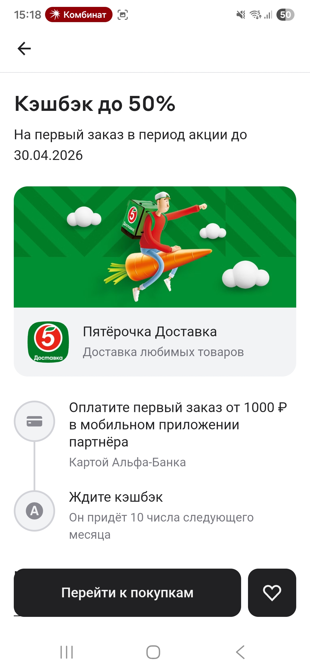 Заходим в приложение альфа-банка. Дальше в лучший кэшбек от партеров. Если видим кэшбек 50% на покупку идем в приложение пятерочка доставка и заказуем доставку. Главное оплатить доставку красной картой. Кэшбек придет 10 числа следующего месяца.