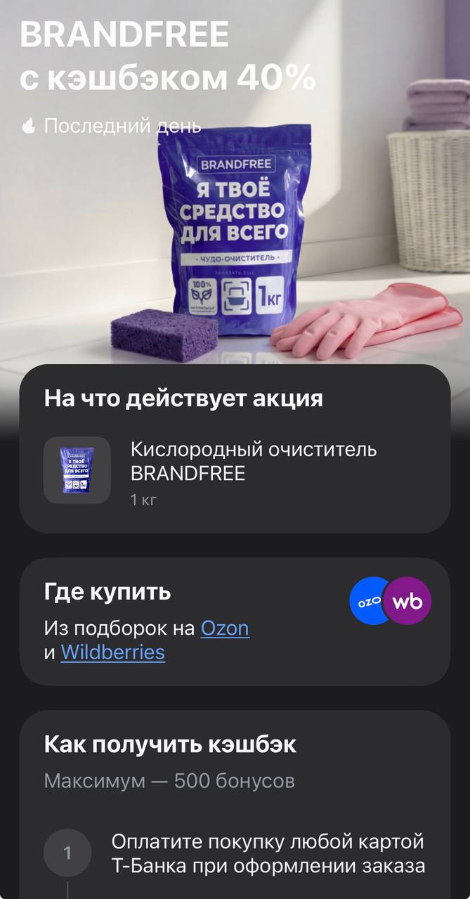 Если горы стирки и генеральная уборка в выходные — ваш личный вид спорта, то Т-Банк сегодня подкинул мощный допинг для бюджета. Только сегодня, 18 апреля, закрывается акция на народный хит маркетплейсов — кислородный очиститель Brandfree. Самое приятное, что банк повысил ставки: если раньше мы видели офферы на 30%, то сейчас это жирные 40% возврата. Это идеальный момент, чтобы пополнить запасы универсального порошка, который отмывает буквально всё — от белых кед до накипи в технике, особенно...