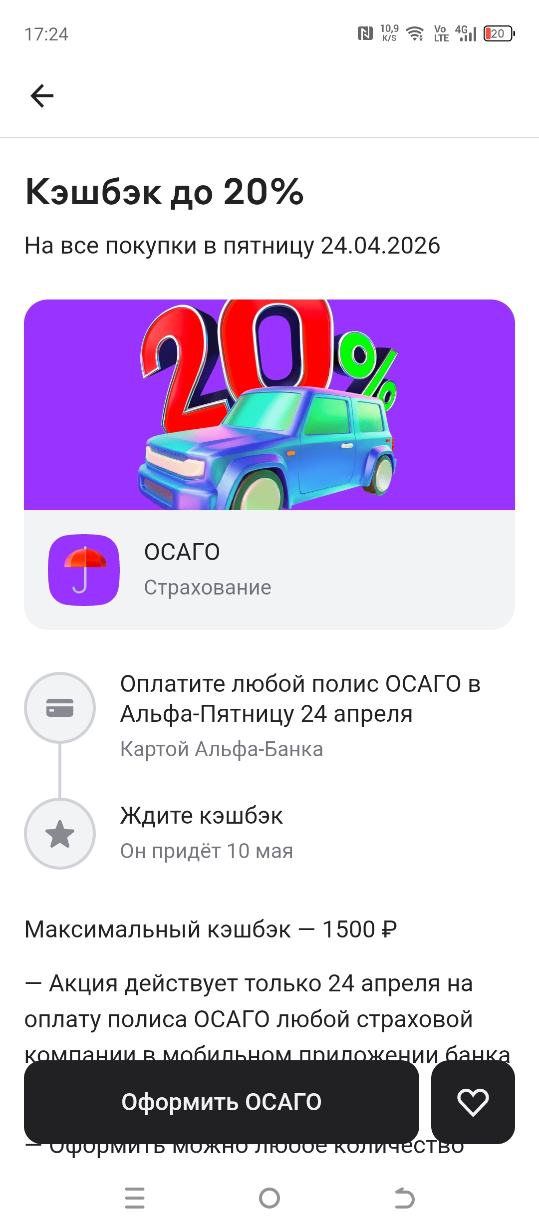 Оплатите любой полис ОСАГО в Альфа- пятницу 24 апреля( картой Альфа-Банка). Максимальный кэшбэк-1500₽. - Акция действует только 24 апреля на оплату полиса ОСАГО любой страховой компании в мобильном приложении банка или Альфа онлайн.