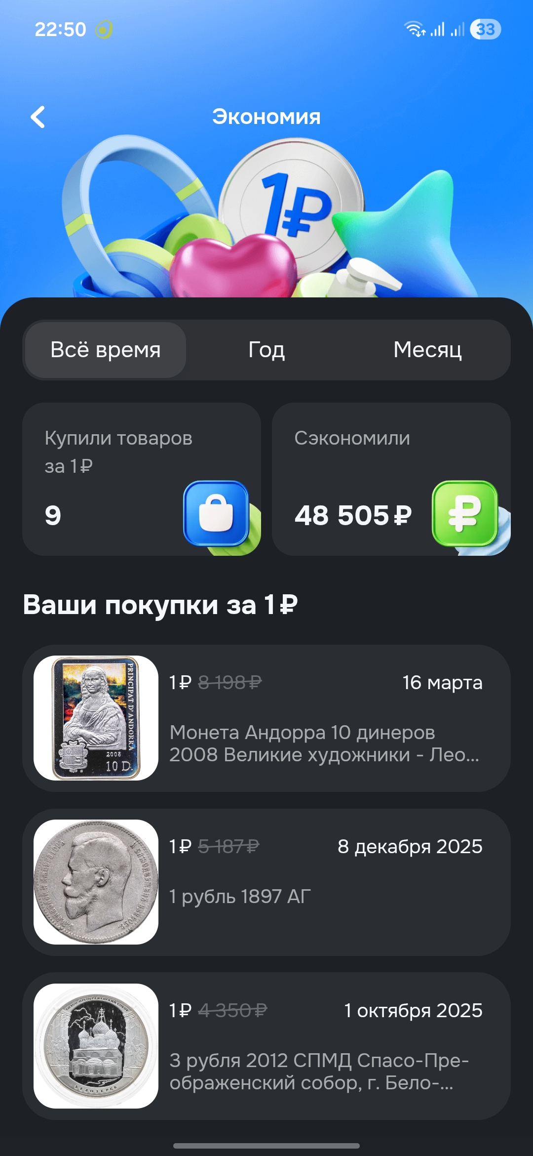 Я уже не раз так покупал — серебрянные монетами и одну даже золотую. За 1 рубль набрал несколько позиций, которые в обычное время стоили в разы дороже. Главное — следить за обновлениями.