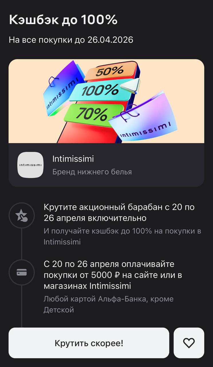 Если вы планировали обновить домашний гардероб или подыскивали подарок, который точно оценят, — Альфа вовремя подкатила с крутым интерактивом. На этой неделе банк запустил «аттракцион щедрости» специально для фанатов бренда Intimissimi. Схема простая: заходите в приложение, крутите анимированный барабан и ловите свой персональный процент возврата. Кому-то выпадают скромные цифры, а кому-то везет на честные 100% кэшбэка, что фактически превращает поход в бутик в бесплатный шоппинг.