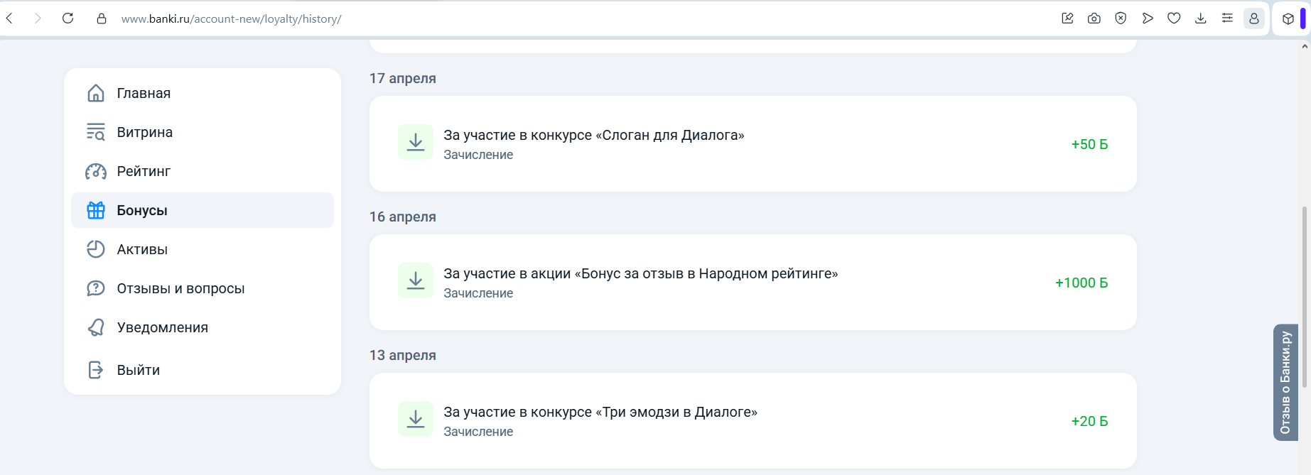 А 16 апреля я уже получила бонус за свой отзыв. 😊 Как приятно. Бонус конечно же не должен быть самоцелью, а только приятным бонусом, чтобы мы активнее могли делиться опытом взаимодействия с банками. Опыт, как положительный, так и отрицательный. Бонусы начисляются по определённым банкам (их перечень обновляется регулярно) и за положительные зачтённые оценки (5* и 4*).
