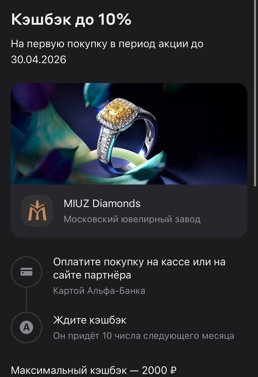 Очередной раз зашел в приложение Альфы и увидел, что они решили добавить немного блеска в нашу ленту трат. На этот раз акция с Московским ювелирным заводом — MIUZ Diamonds. Предлагают кэшбэк до 10% за первую покупку в период акции. Ювелирка — это всегда серьезная статья расходов, будь то подарок близким или небольшое вознаграждение самому себе за ударный рабочий месяц. Поэтому даже 10% возврата на такие суммы превращаются в ощутимую экономию, на которую потом можно еще и в ресторан сходить...