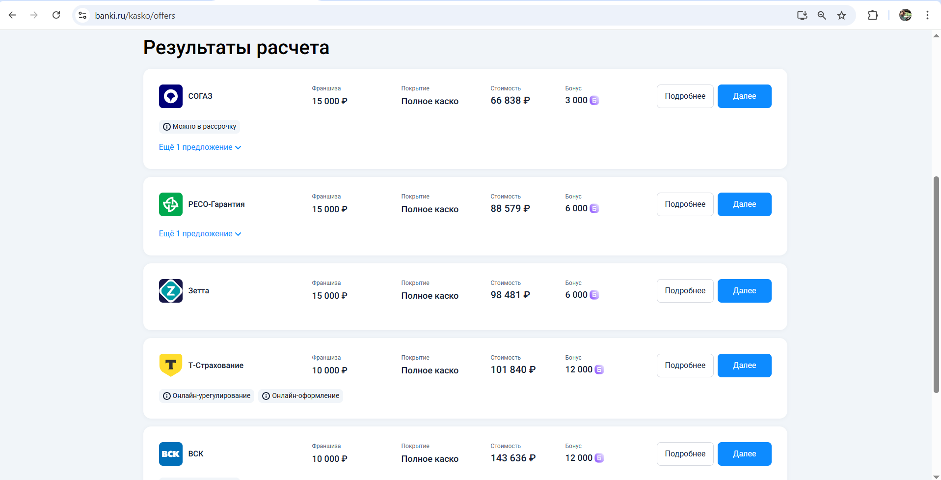 Выбираем страховую исходя из цены полиса, рейтинга страховой и нажимаем "Далее". Оформляем страховой продукт.