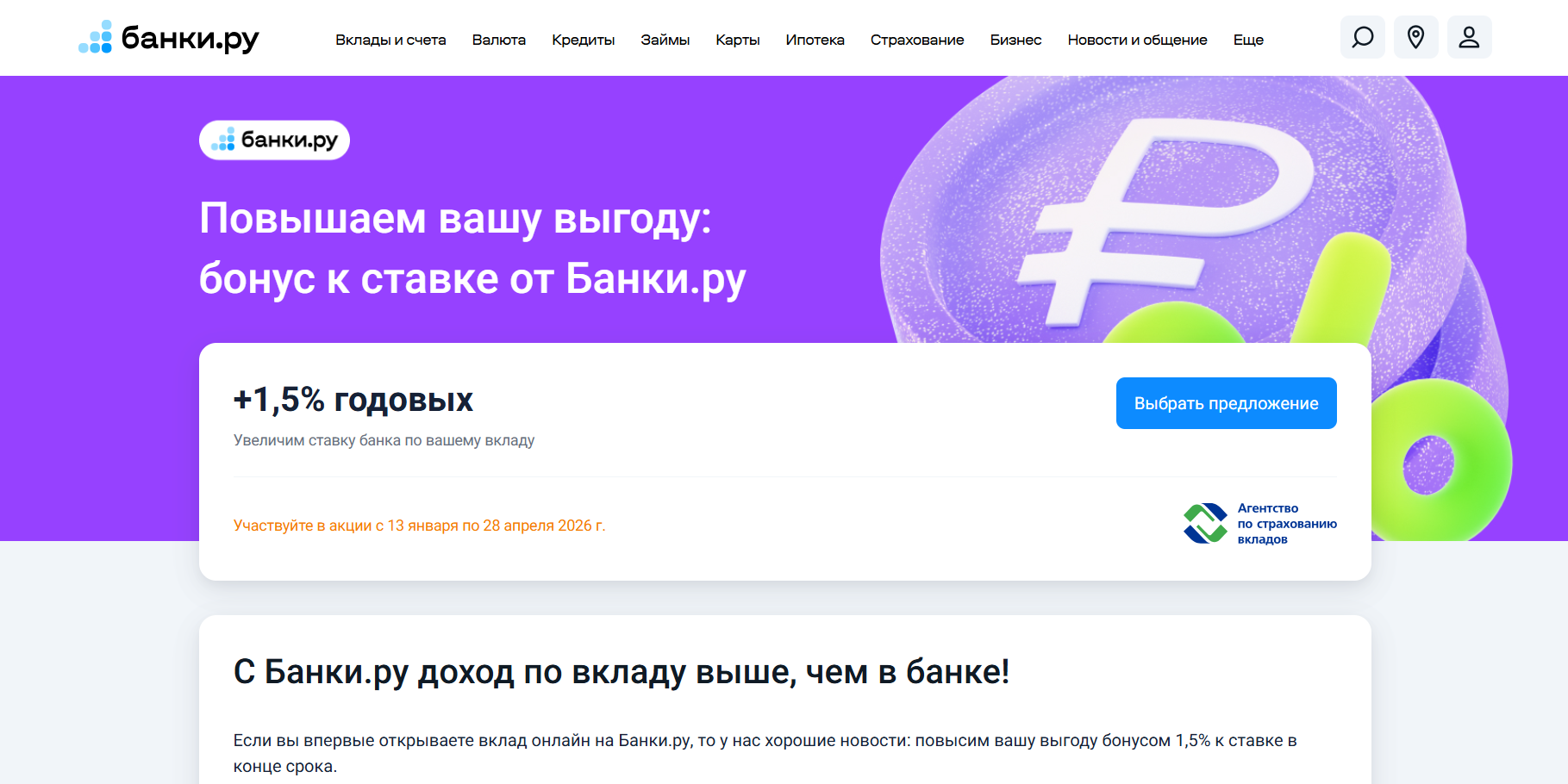 Сейчас действует акция +1,5% годовых за открытие вклада на банки.ру впервые.