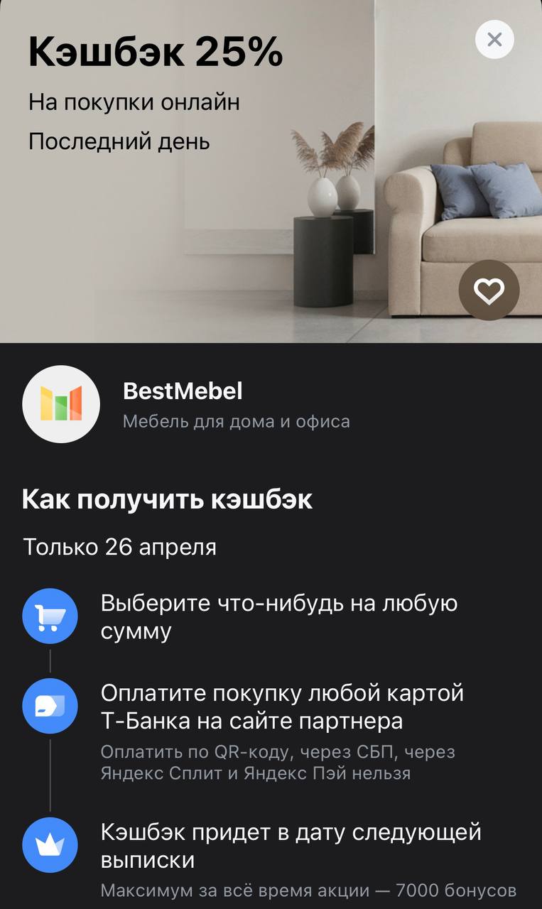 Если вы давно планировали обновить рабочее место, купить новый комод или тот самый стеллаж, до которого не доходили руки, сегодня — идеальный момент. Мебель — покупка серьезная и обычно недешевая, поэтому кэшбэк в четверть стоимости превращает даже дорогой шкаф в очень приятное приобретение. В приложении Т-Банка сегодня «вспыхнуло» предложение: 25% возврата на покупки в BestMebel.