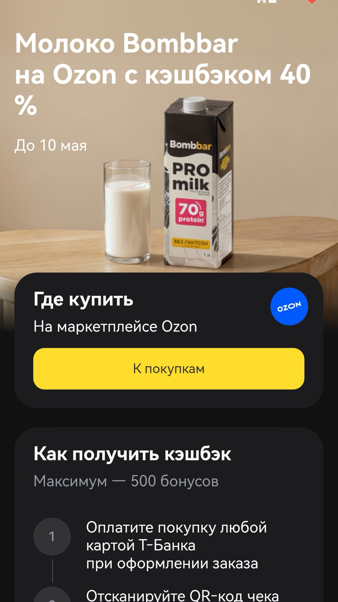 И снова Т-банк предлагает акцию с кэшбеком на молоко Bombbar. Сегодня, просматривая актуальные акции и предложения в приложении Т-банка, раздел "Товары с кэшбеком", увидел выгодный кэшбек 40% на молоко бренда Bombbar.