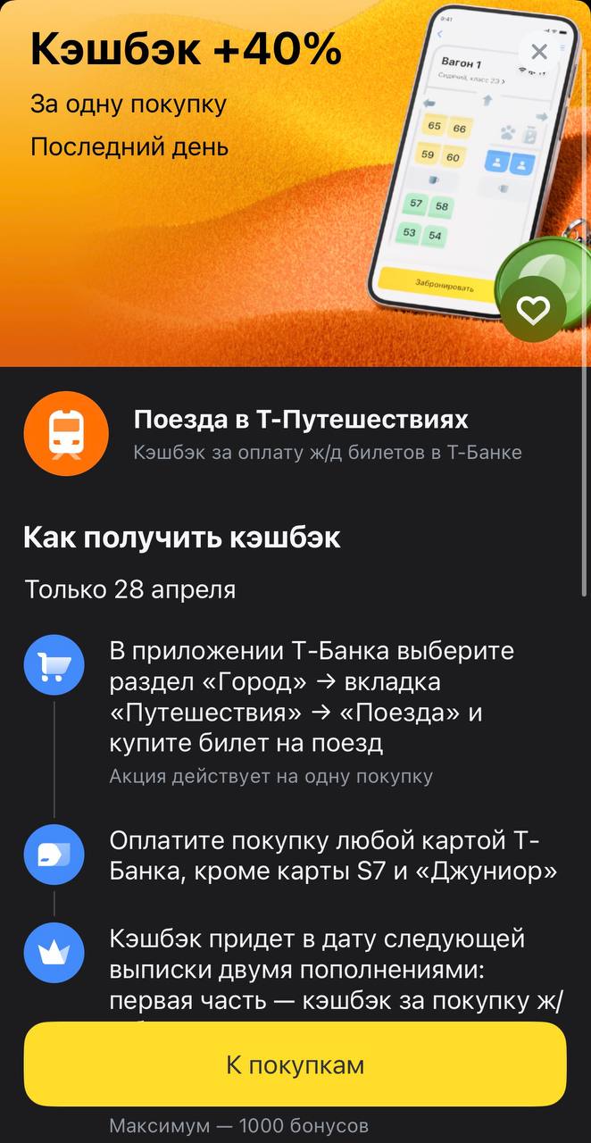 Т-Банк продолжает серию щедрых однодневных акций, и сегодня в центре внимания — железная дорога. Если вы планировали поездку на майские праздники или просто собирались навестить близких в соседнем городе, 28 апреля — лучший день, чтобы оформить билеты. Вернуть почти половину стоимости поездки — это предложение, которое превращает обычный вояж в действительно бюджетное путешествие.