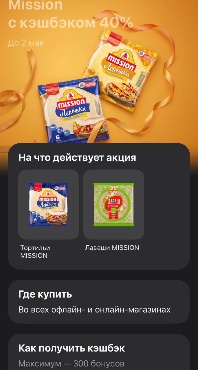 Если вы любите быстрые перекусы, домашние роллы или сочные кесадильи, то Т-Банк сегодня подкинул отличный повод забить кухонный шкаф базой для этих блюд. Дают 40% кэшбэка на продукцию бренда Mission. Учитывая, что лепешки хранятся довольно долго, это идеальный момент, чтобы взять несколько пачек впрок — с таким возвратом они обходятся почти в два раза дешевле обычного.