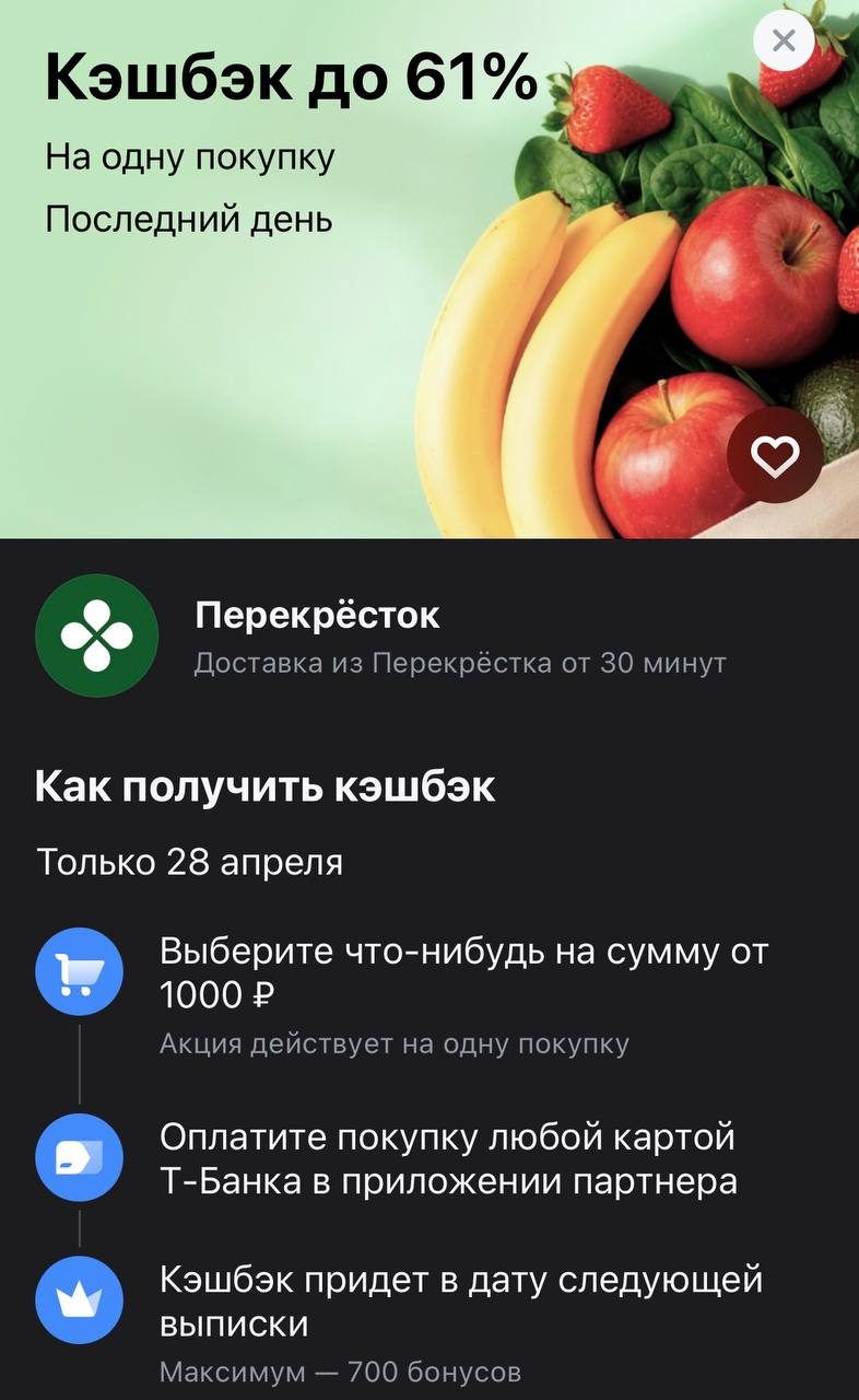 Пока все вовсю планируют шашлыки и праздничные выходные, Т-Банк решил устроить локальный праздник для тех, чьи холодильники просят пополнения. Возврат в 61% — это уже не просто приятный бонус, а практически легальный способ забрать продукты за бесценок. Если планировали закупку на неделю или просто лень идти в магазин за молоком и хлебом, сегодня тот самый день, когда лень вознаграждается финансово.