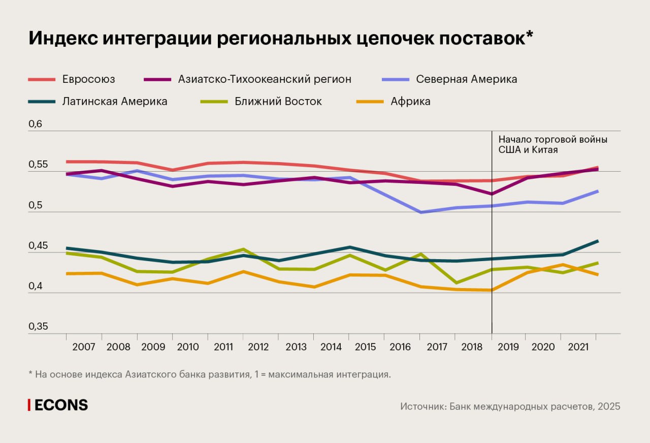 В условиях растущей глобальной фрагментации наблюдается укрепление региональной экономической интеграции. Однако эта интеграция не заменяет глобальные экономические связи, а скорее дополняет их. Основная часть спроса на товары из развивающихся стран по-прежнему исходит извне региона, что ограничивает степень самостоятельности региональных рынков.