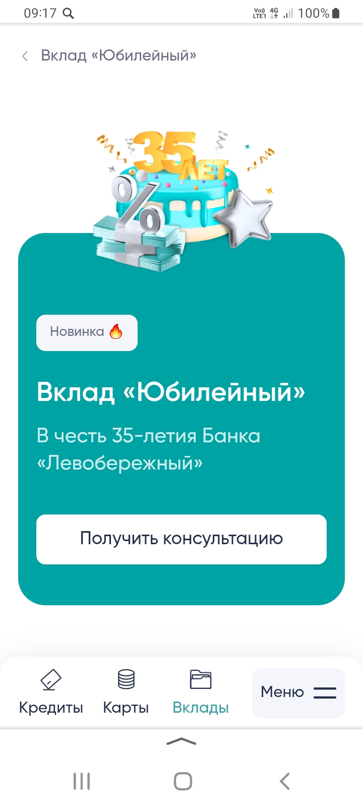 Банк ,, Левобережный,, ввёл вклад,, Юбилейный,, условия привлекательные , особенно, для действующих клиентов банка и зависят от срока сотрудничества. Макс ставка может достигать 18%. Новым клиентам, к сожалению , всего- 15%.