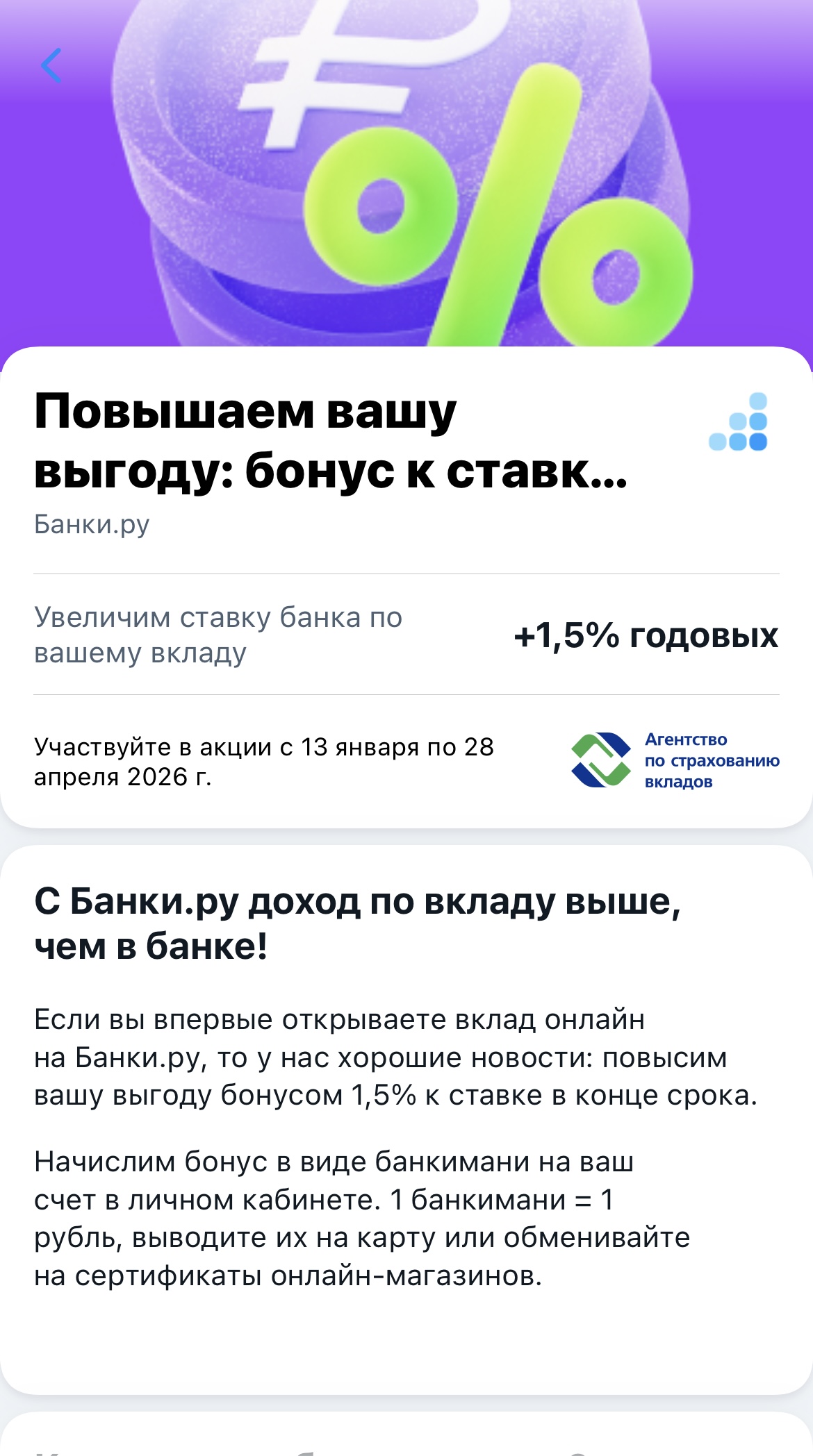 Привет, новый клиент! Вы только начинаете свой путь с нами — и мы хотим, чтобы он начался с чего‑то особенного. Представьте: ваши сбережения не просто лежат на счёте, а работают активнее обычного. Как? Благодаря акции «Вклад с бонусом» — мы дарим вам дополнительные +1,5% к ставке! Да, вы не ослышались: сразу +1,5% сверху — это наш подарок за то, что вы с нами.