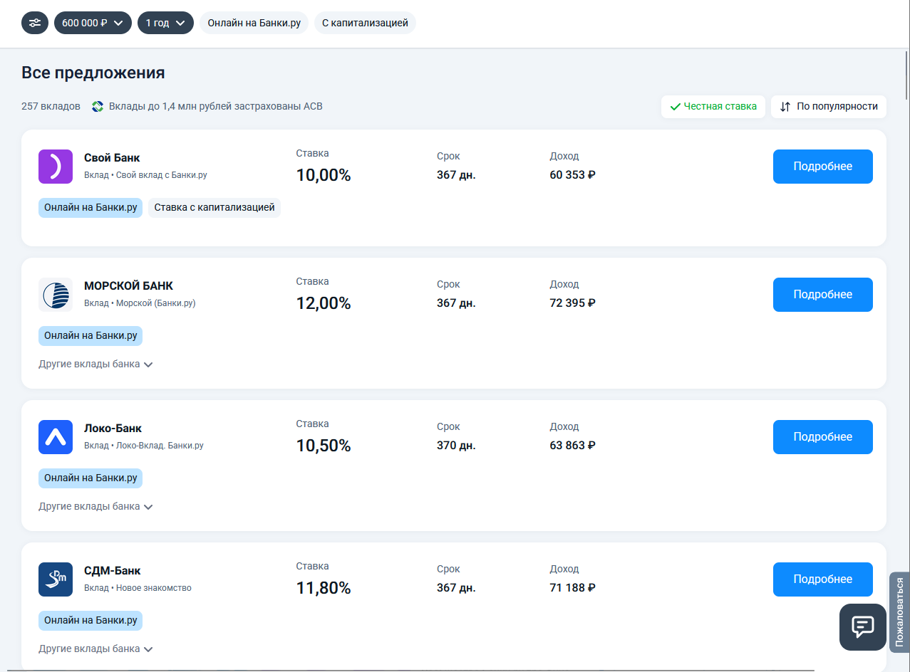 Недавно у меня освободилась сумма ~600 000 ₽, и я решил разместить её во вклад. Казалось бы — задача простая: выбрать максимальную ставку и открыть. Но на практике всё оказалось чуть сложнее, и именно через маркетплейс Банки.ру получилось разобраться в деталях и не допустить ошибок.
