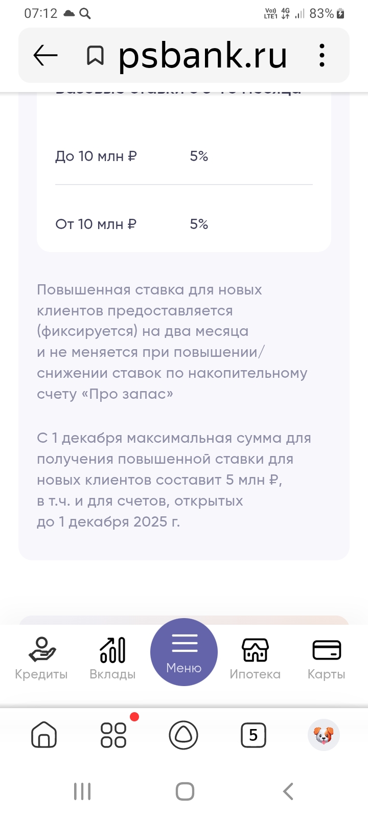Ставка действует на остаток до 5 млн рублей.