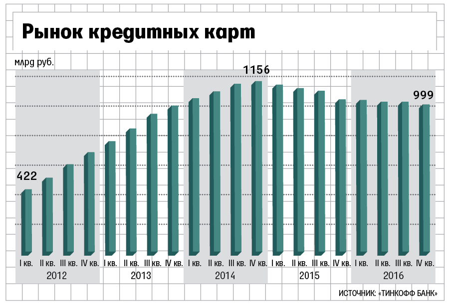 Рынок кредитных карт в России на трехлетнем минимуме – 999 млрд руб., говорится в обзоре «Тинькофф банка» за 2016 г. Последний раз размер рынка был меньше 1 трлн 1 января 2014 г. – 990 млрд руб. «Тинькофф банк» анализирует отчетность других банков по РСБУ и не учитывает просроченные долги.