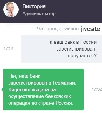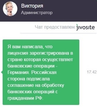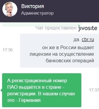 Дальше — больше. Ответы администратора Виктории на вопросы противоречили российскому законодательству. Так, она рассказала, что генеральная лицензия выдана Elios — Export Finance Bank в стране регистрации, то есть в Германии, но при этом позволяет осуществлять операции в России, поскольку «российская сторона подписала соглашение на обработку банковских операций с гражданами РФ». В конце концов администратор дала понять, что Elios — Export Finance Bank — это иностранная платежная система, указав, что информацию о таких системах нельзя найти у российского Центробанка. Хотя ЦБ РФ ведет и своевременно обновляет на своем официальном сайте так называемый реестр операторов платежных систем, в который наравне со всеми входят вполне себе международные Visa, Masterсard и UnionPay.