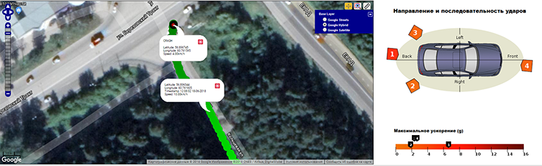 Чтобы избежать столкновения, KIA резко тормозит, но все же на скорости 4 км/ч получает три последовательных удара разной силы в задний бампер, а четвертый — в передний. Из схемы видно, что первый удар был самым сильным (красная шкала на рисунке). Он произошел потому, что автомобиль позади KIA не держал необходимую дистанцию. В итоге он не успевает среагировать, «догоняет» KIA и с небольшим отскоком бьет дважды, после первого удара KIA немного разворачивает. В системе видно, что ударов три, их силу и направление, а также скорость движения автомобиля, на котором установлен блок телематики. Благодаря столь подробным данным удалось восстановить картину полностью и понять, откуда возникли три удара в разные точки.