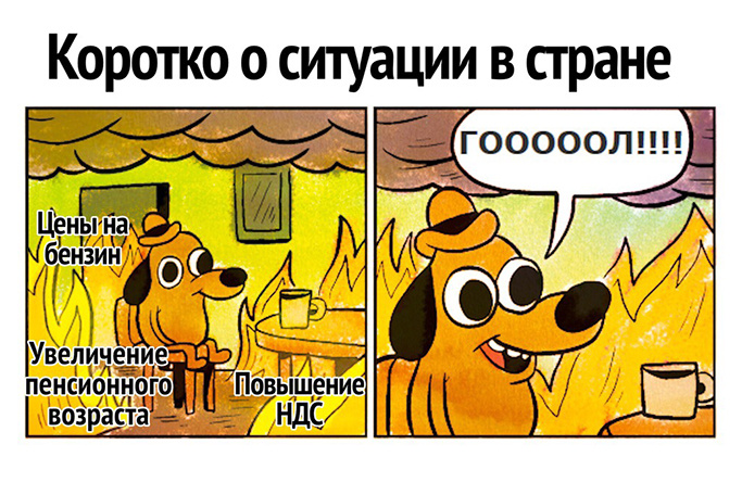Рост цен на бензин, пенсионная реформа, ослабление национальной валюты — эти и многие другие события вызывали самую живую реакцию пользователей Интернета. Не прошли творцы мемов и мимо таких злободневных тем, как крах финансовых пирамид, падение биткоина и введение налога для самозанятых.