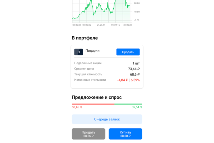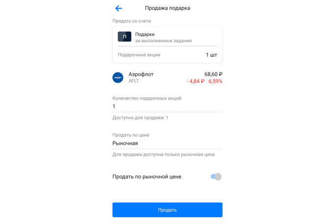 Все ценные бумаги, даже копеечные, шли лотами по одной штуке, что делало их непродаваемыми. Например, акции «Аэрофлота» торгуются по десять штук, и при попытке обналичить такой «подарок» можно по ошибке взять их в шорт. То есть продать в кредит, причем не за бонусные, а за настоящие собственные рубли. Проблема решалась тем, что нужно было пролистать в приложении до кнопки продажи именно подарочной акции. А потом уже на вырученные деньги покупать настоящие ценные бумаги.