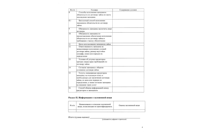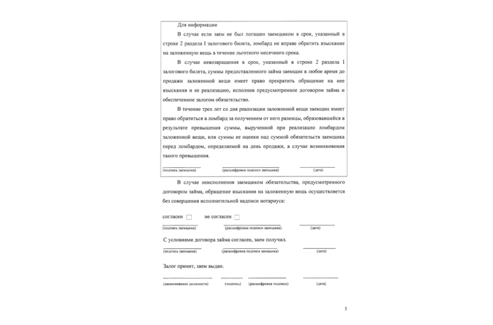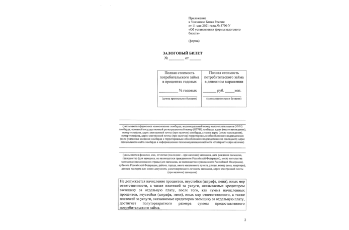 Когда клиент принес вещь в ломбард, сотрудники должны бесплатно оценить стоимость залога и четко проинформировать об условиях. Если клиента устраивают предложенные условия, то ему должны выдать залоговый билет. Форма документа строго регламентирована Центральным банком. В билете отражена информация о залоге, а также условия — полная стоимость потребительского займа, сроки возврата, процентная ставка и так далее.