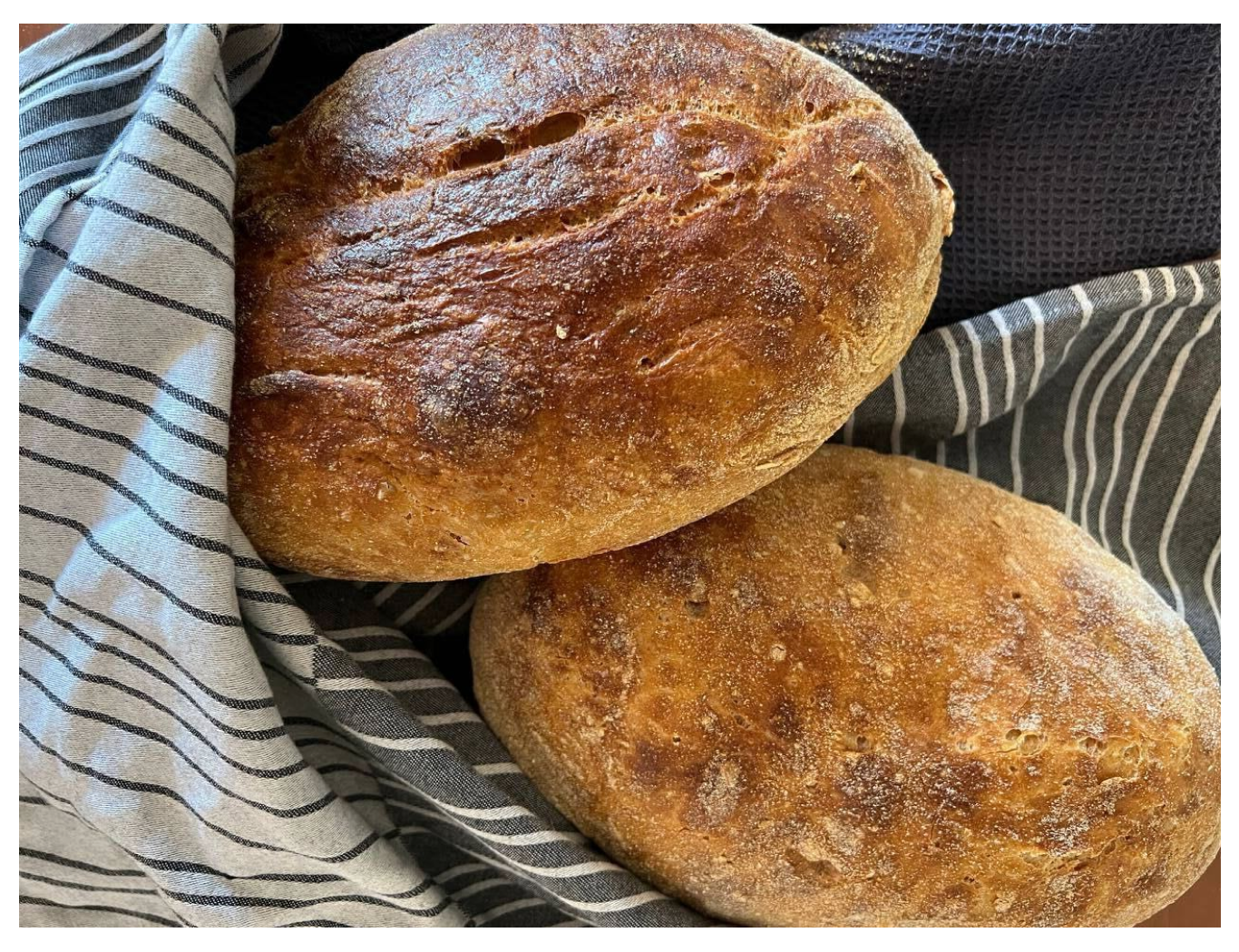 - Дальше выпекайте. Держите под крышкой или фольгой в духовке на 250 градусах. Через 20 минут уберите крышку, снизьте температуру до 230 градусов и готовьте еще минут 15–20. Хлеб готов!