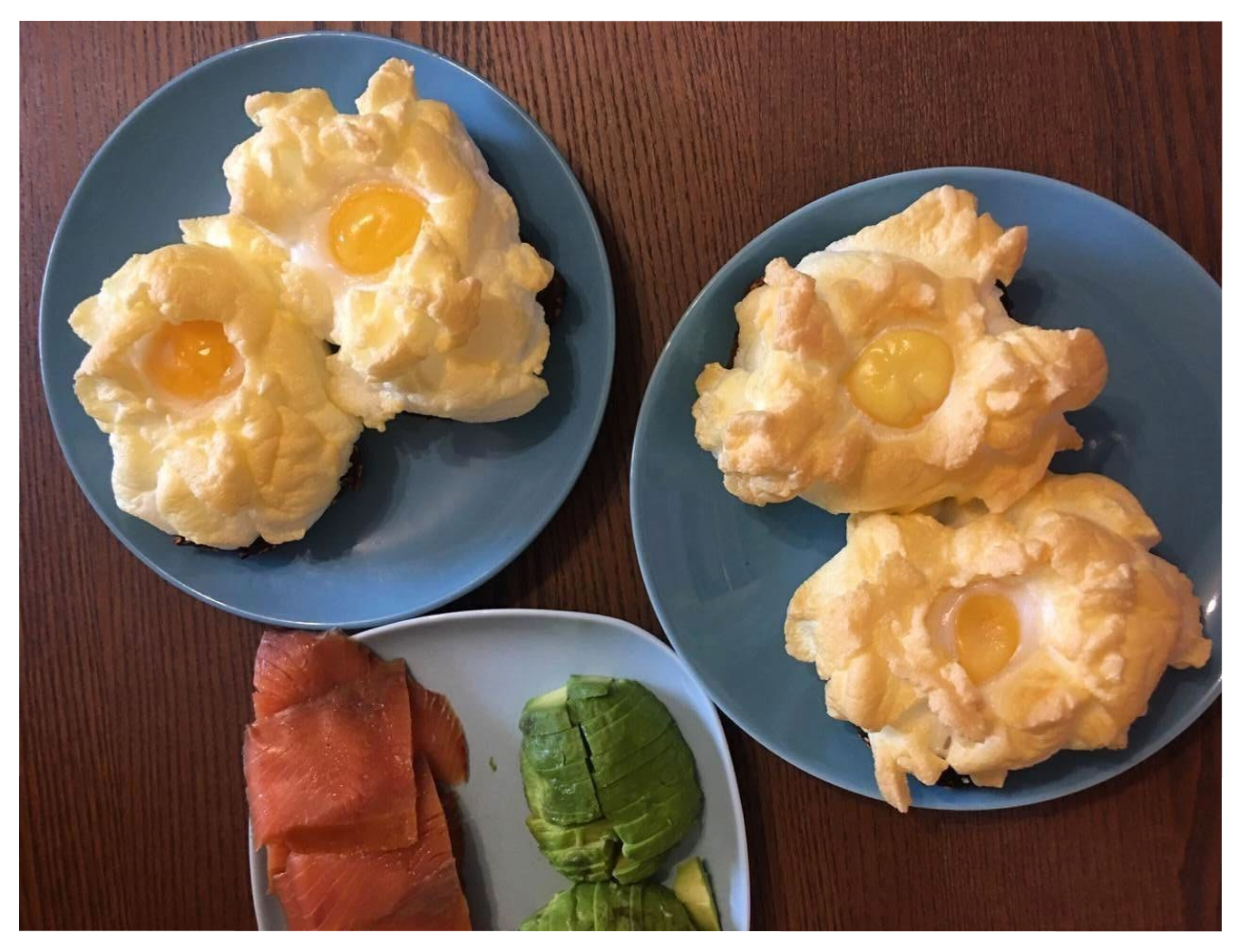 - На тосты выкладываем толстым слоем белковую пену, сделав небольшое углубление для желтка в центре. Ставим на 5 минут в духовку.