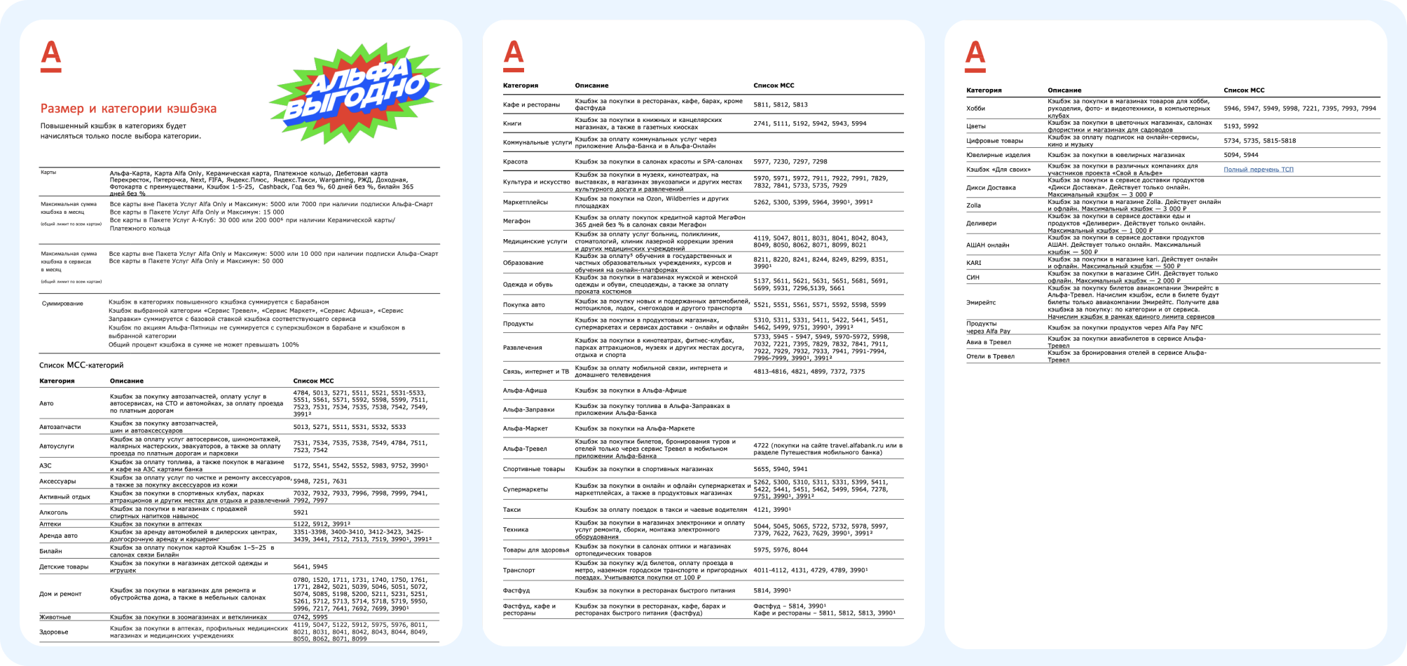 По данным на август 2025 года, в Альфа-Банке за категориями закреплены следующие МСС-коды: