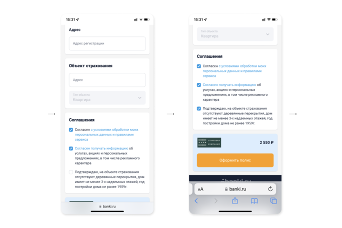 Если вы оформляете комплексный полис (нажали Квартира + Жизнь на предыдущем шаге), на этом шаге вам нужно будет ввести дату начала действия полиса, личные данные страхователя, возраст, пол, рост и вес, электронную почту и номер телефона, паспортные данные, адрес регистрации и адрес приобретаемого в кредит объекта недвижимости. Перед оформлением полиса подтвердите, что ваше здоровье и объект страхования соответствуют требованиям: например, в квартире нет деревянных перекрытий, дом выше трех этажей и построен позже 1959 года.