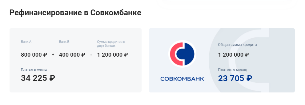 - Рефинансирование позволяет регулировать долговую нагрузку. С помощью калькулятора выбирайте срок и комфортную сумму ежемесячного платежа. Совкомбанк предлагает срок выплаты до пяти лет.