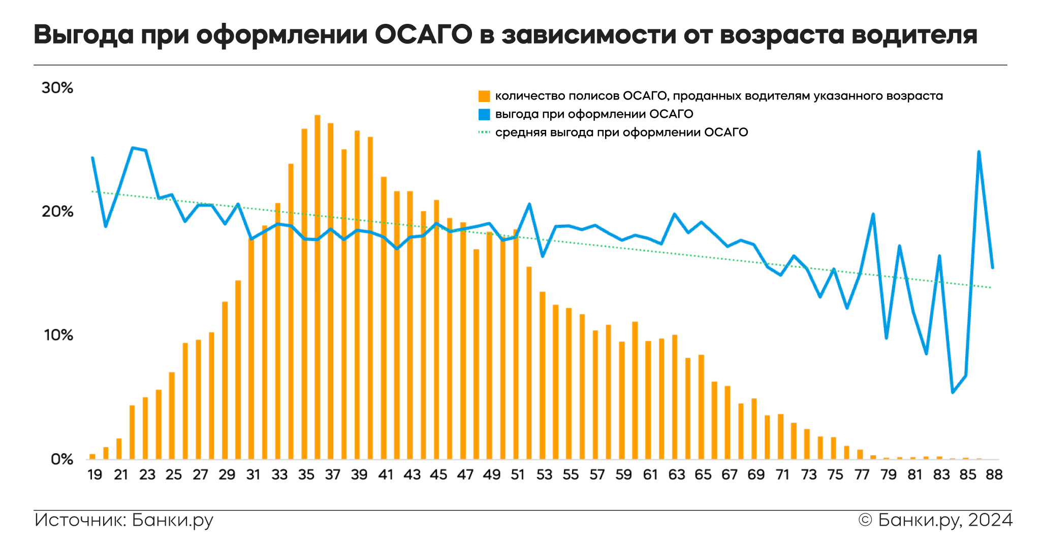 Кроме того, эксперты проанализировали, как зависит экономия от возраста клиента. Если смотреть по возрасту клиента, то страховые компании чаще делают более выгодные предложения молодым водителям, хотя в целом водителей среднего возраста больше, чем молодых и возрастных: