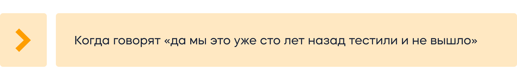 Приходит новичок, предлагает идею для теста и получает в ответ: «Мы это тестили, но не вышло». Рынок бежит на космических скоростях, аудитория меняется, и то, что раньше не работало, может выдать крутой результат. Имейте привычку с некоторой периодичностью перепроверять жизнеспособные гипотезы, чтобы не упустить точки роста.