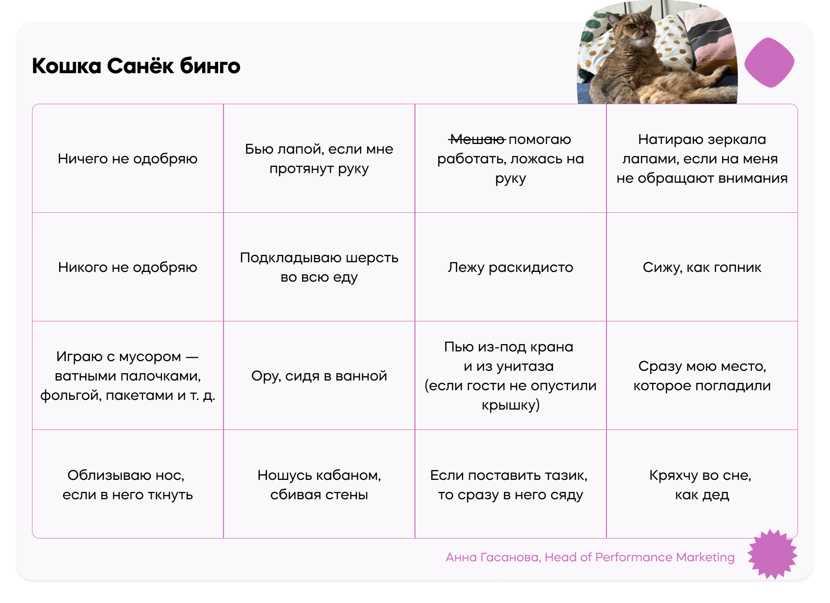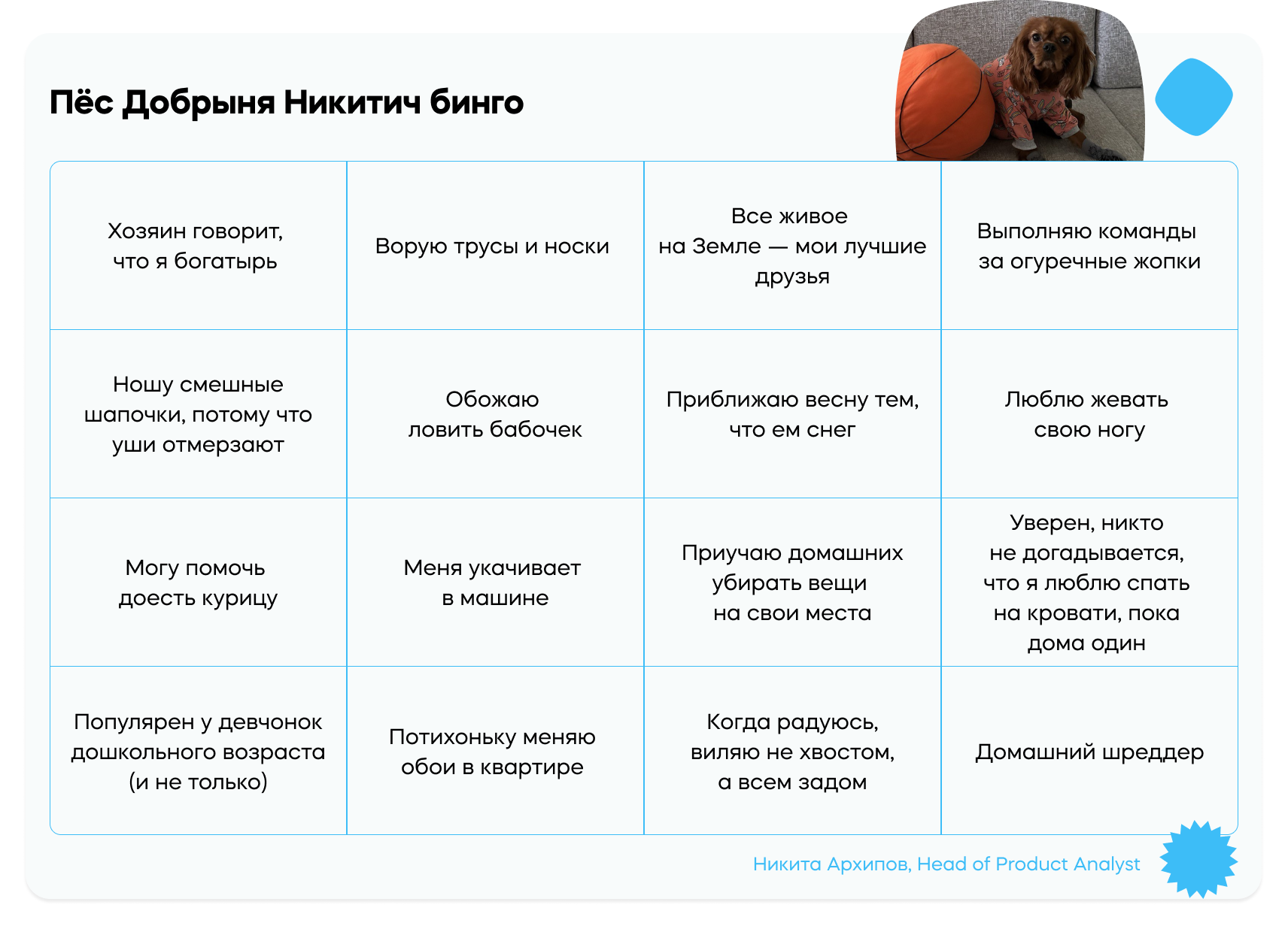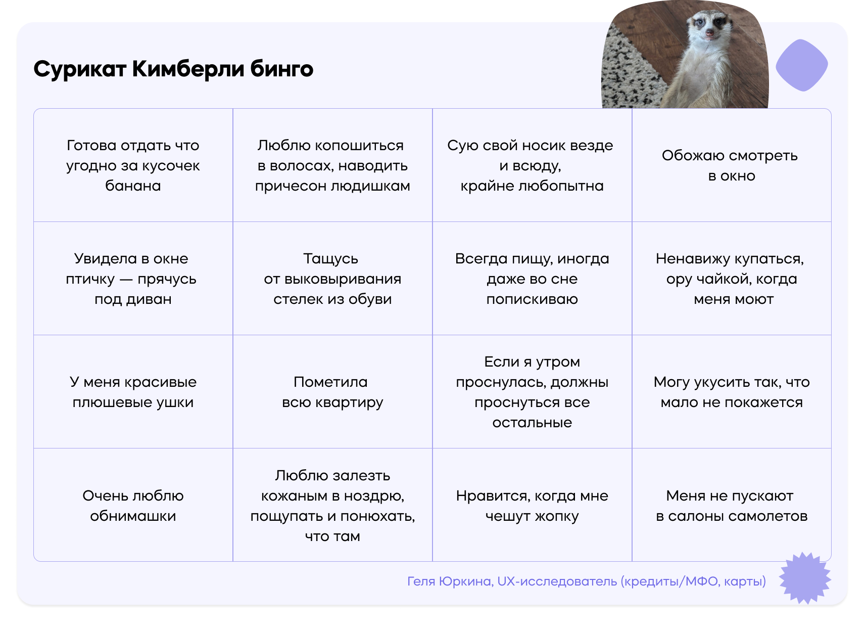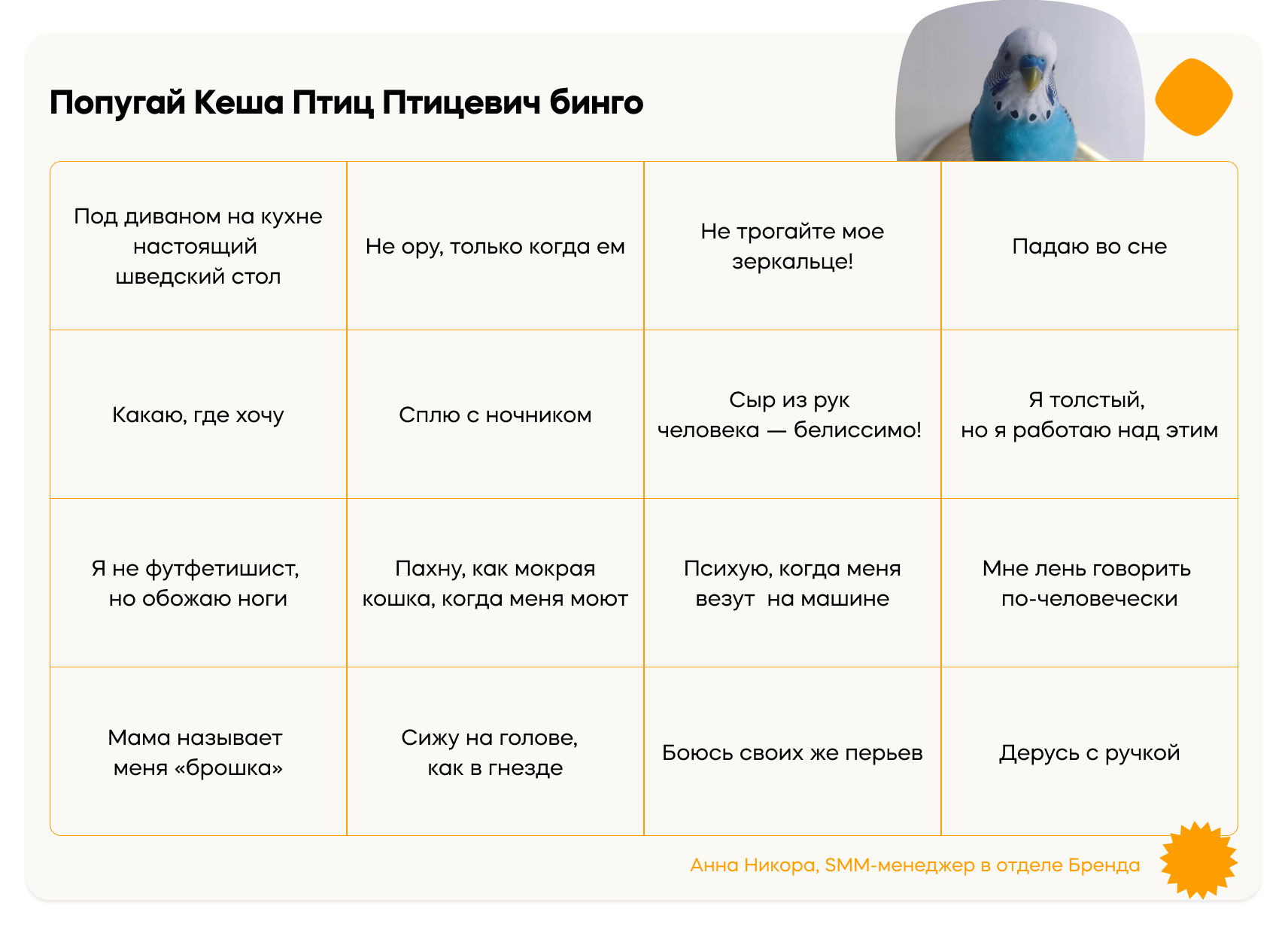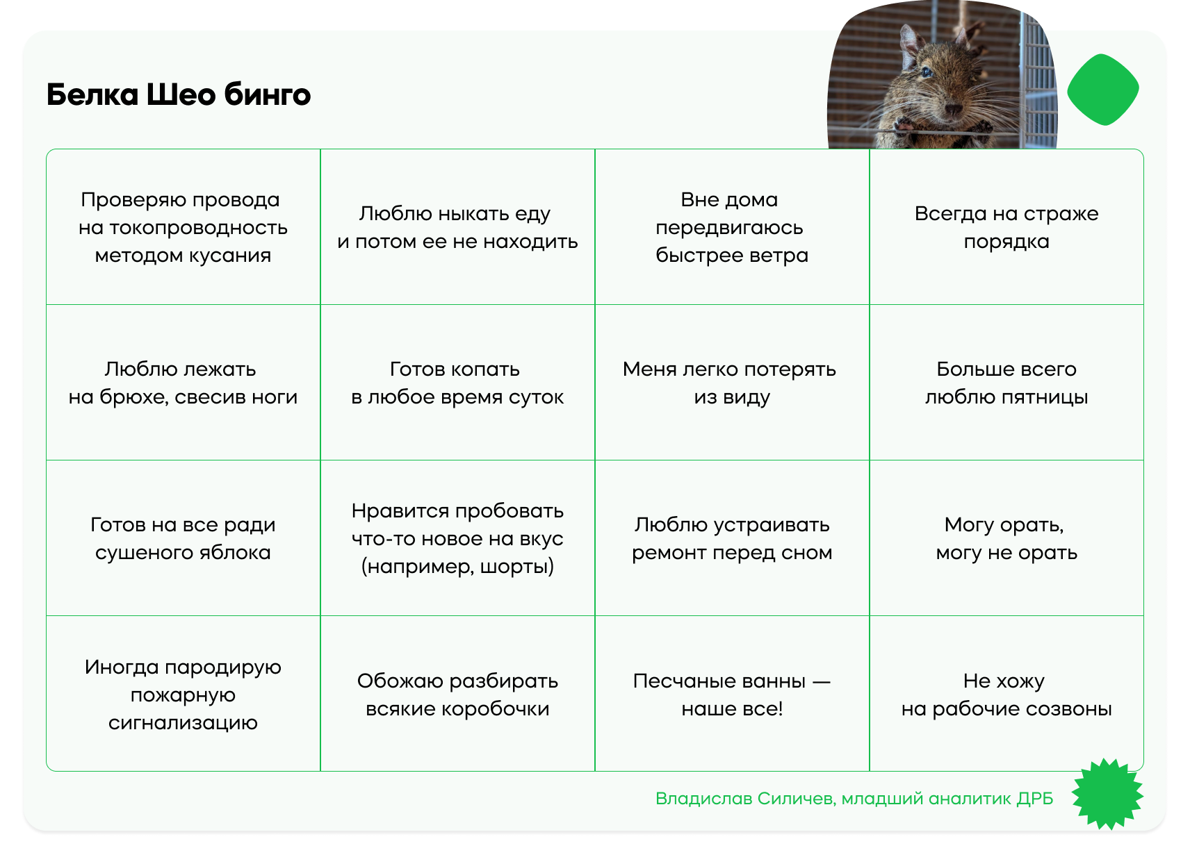 Собрали интересные факты о животных — компаньонах наших сотрудников, в бинго. Делайте скриншот или сохраняйте картинки на компьютер, отмечайте совпадения и узнавайте, насколько вы похожи на героев чата #banki-pets 😊
