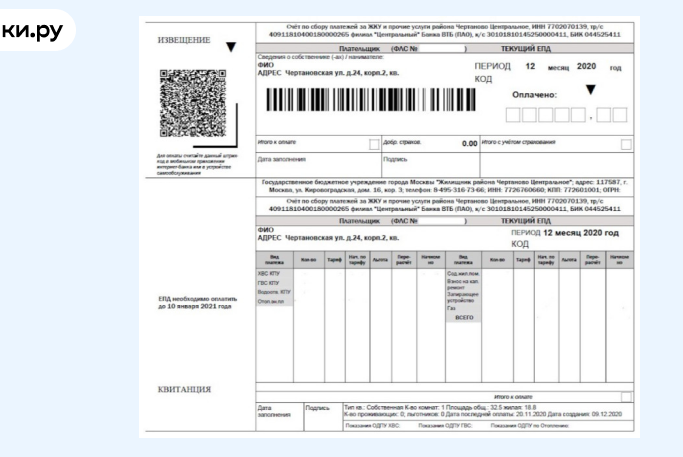 - наименование исполнителя жилищно‑коммунальных услуг (ЖКУ), контакты, номер его банковского счета и реквизиты;