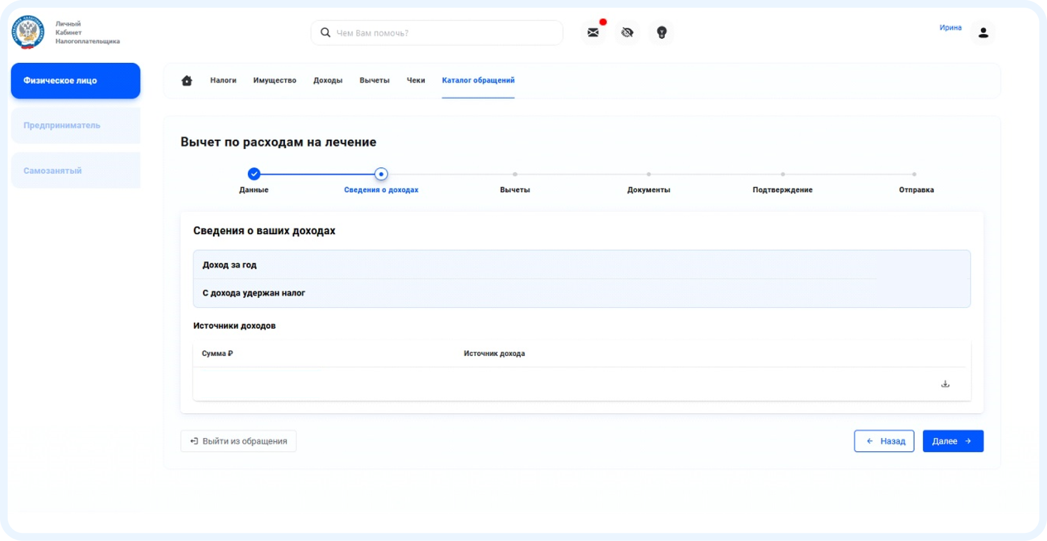 «Физические лица» → «Вычеты» → «Получить вычет» → «Вычет при лечении или покупке медикаментов».