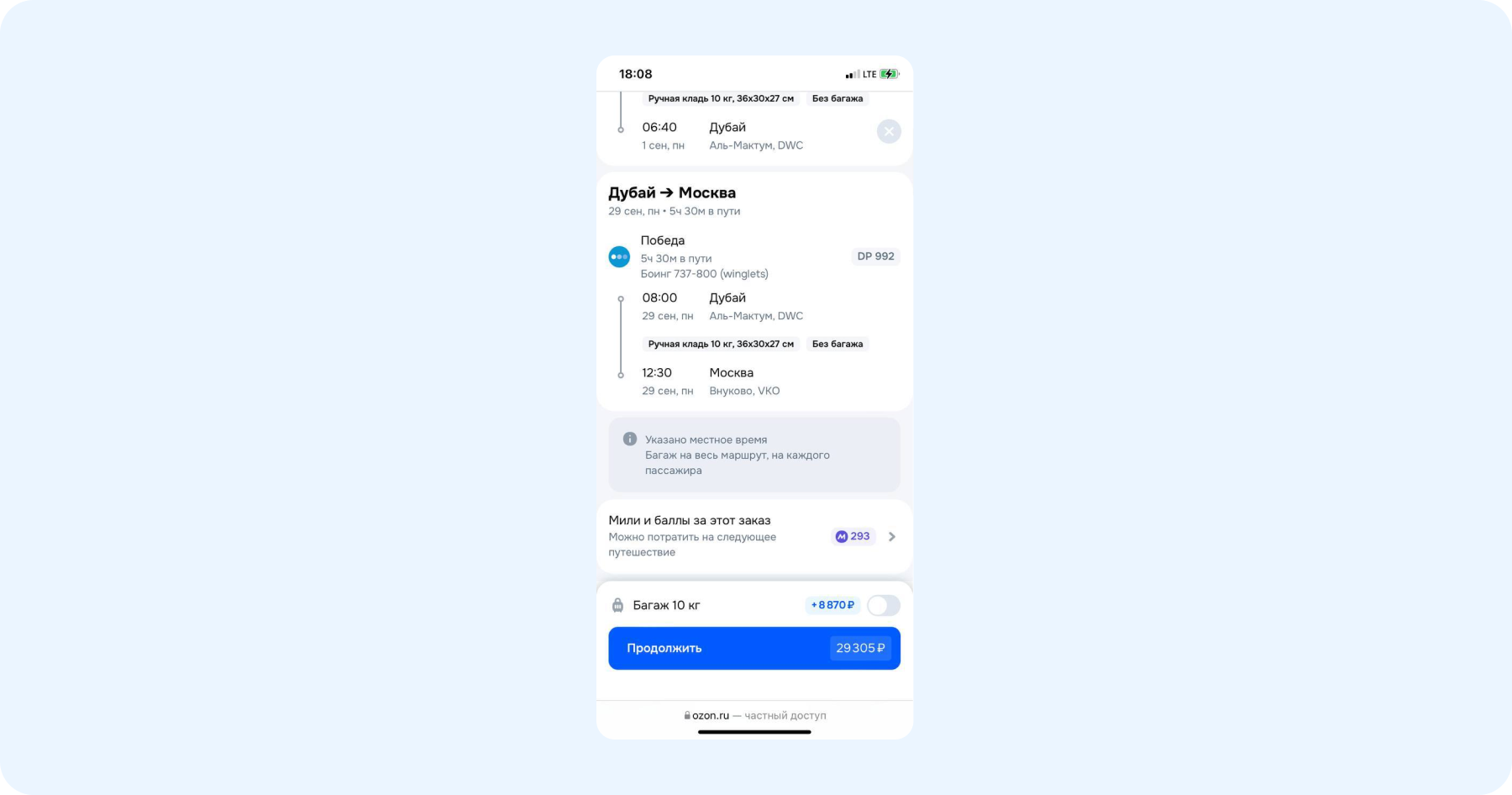 - На экране появится выбранный рейс (или рейсы) и его стоимость, подтвердите выбор кнопкой «Продолжить».