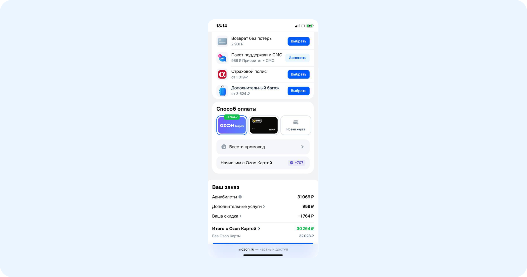 - На следующем экране можно выбрать место в салоне и другие платные услуги. Там же раздел с оплатой — нужно выбрать подходящий и оплатить. При оплате Ozon-картой полагается скидка. В нашем случае — 1764 рубля. Также за покупку будет начислен кэшбэк 707 мили, их можно потратить на будущие поездки.