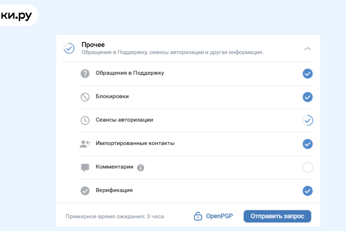 - Если же вы возвращаться не собираетесь, перед тем как удалить аккаунт в ВК навсегда, сохраните все данные. Можно выбрать, какие именно: аудиофайлы, фотографии, картинки, которые вы когда-то лайкнули, платежи и переводы и так далее. Все это автоматически соберется в одну папку, и ссылка придет вам во входящие сообщения. Как скоро необходимые вам данные соберут в одну папку, зависит от их объема, но обычно это занимает не слишком много времени — вы даже не успеете передумать об удалении аккаунта.