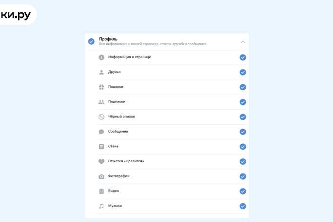 - профиль (вся информация о вашей странице, список друзей и сообщения);