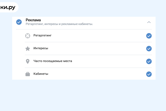 - реклама (ретаргетинг, интересы и рекламные кабинеты);