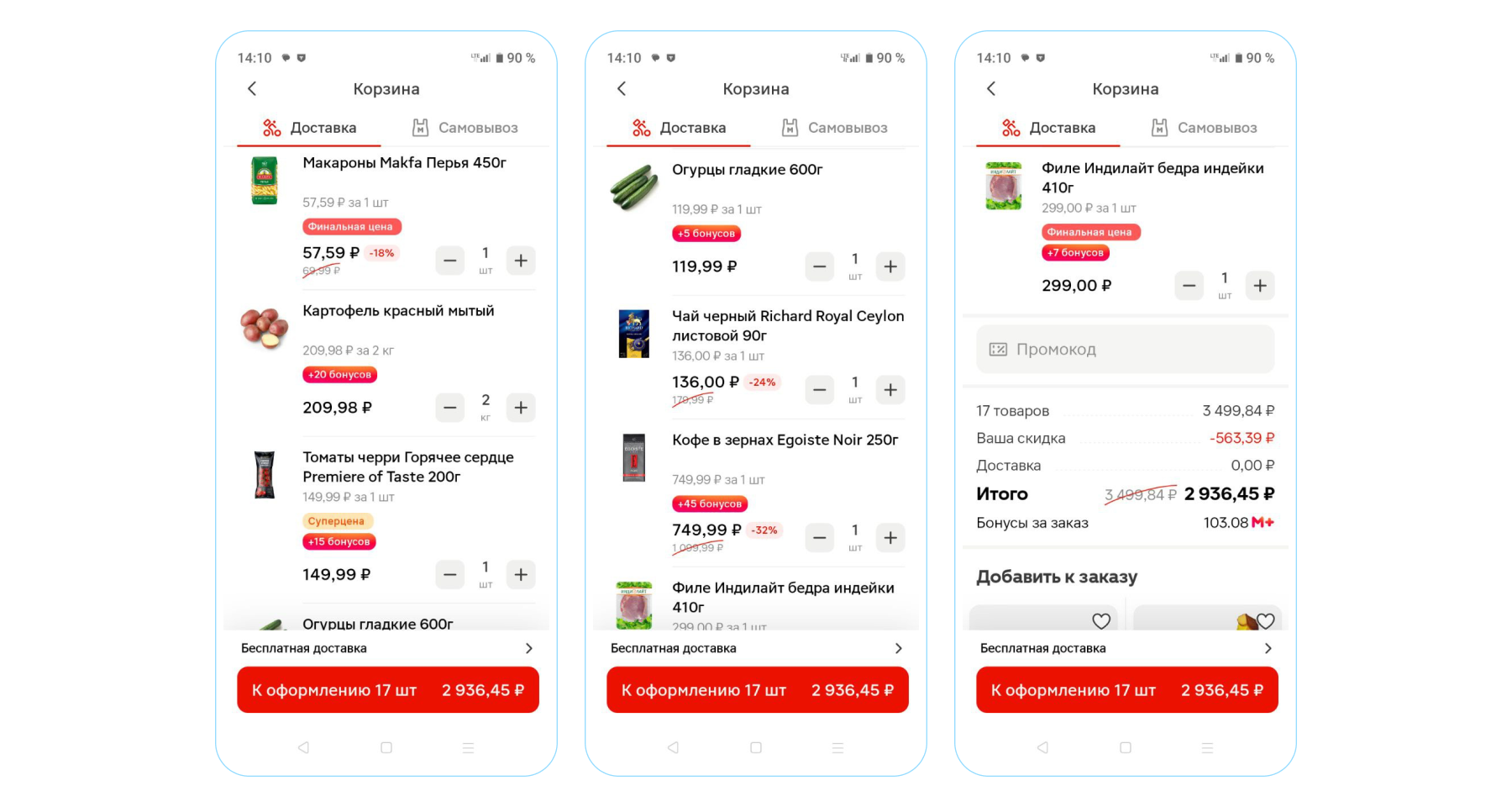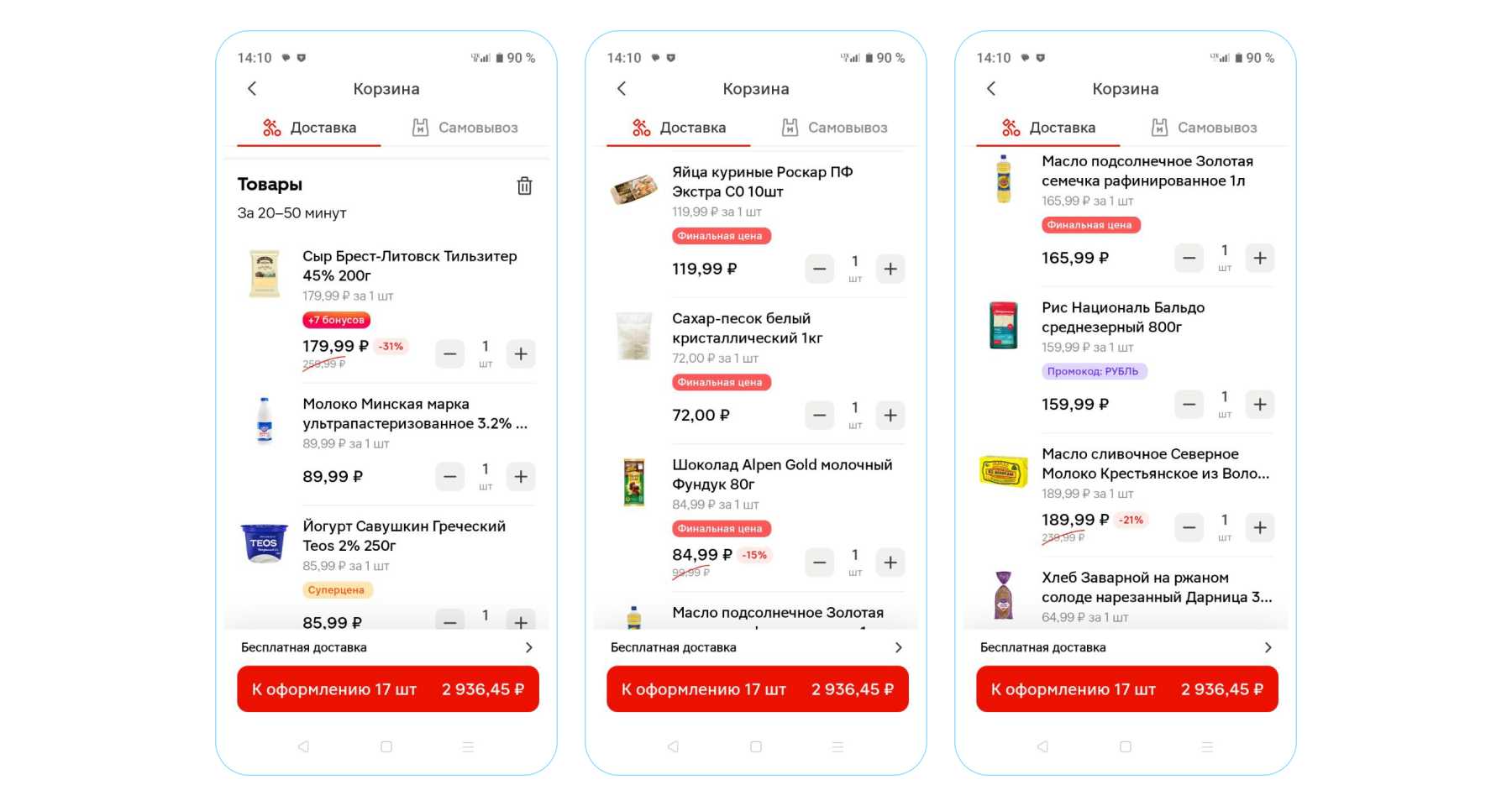 — Собрали корзину из 17 товаров разных категорий. Состав корзины в магазине у дома и в доставке одинаковый.