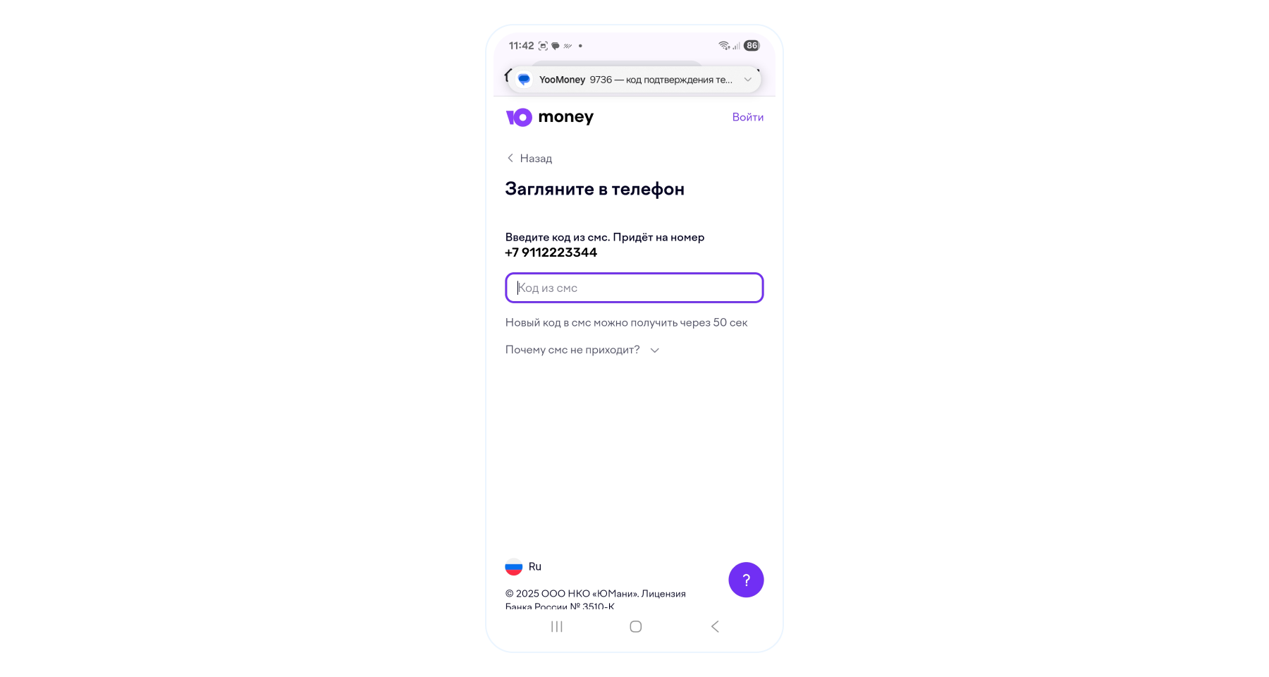 Иногда сообщение просто задерживается на пару минут: нужно подождать и запросить код снова, также можно перезапустить телефон. Если ничего не пришло, можно позвонить в службу поддержки оператора и узнать, нет ли проблем с доставкой СМС, разрешен ли прием сообщений с коротких номеров. Также возможно, что память телефона переполнена. Можно попробовать переставить сим-карту в другой телефон. Если проблема не решена, стоит обратиться в поддержку ЮMoney.
