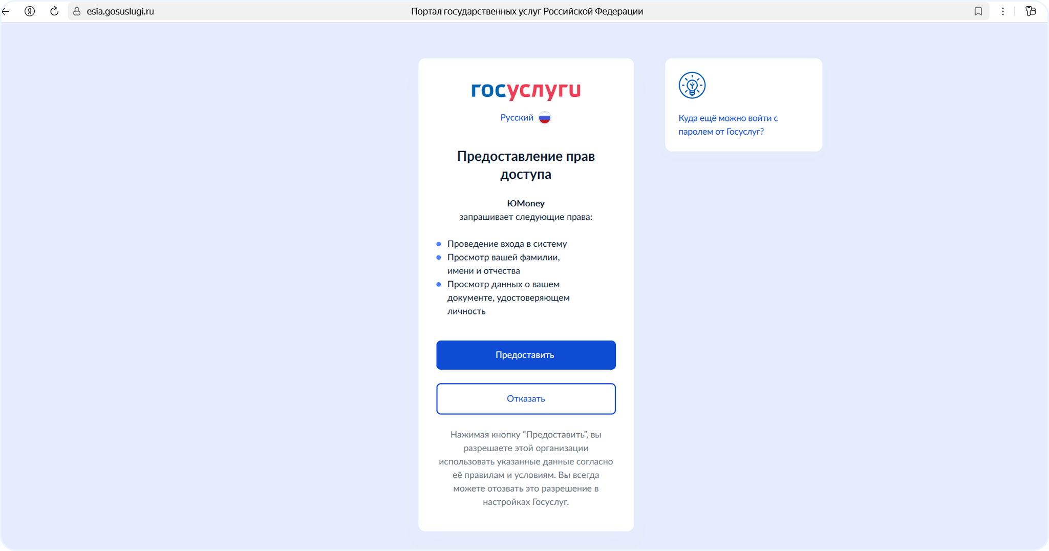 - Предоставьте права доступа ЮMoney, нажав на «Предоставить».