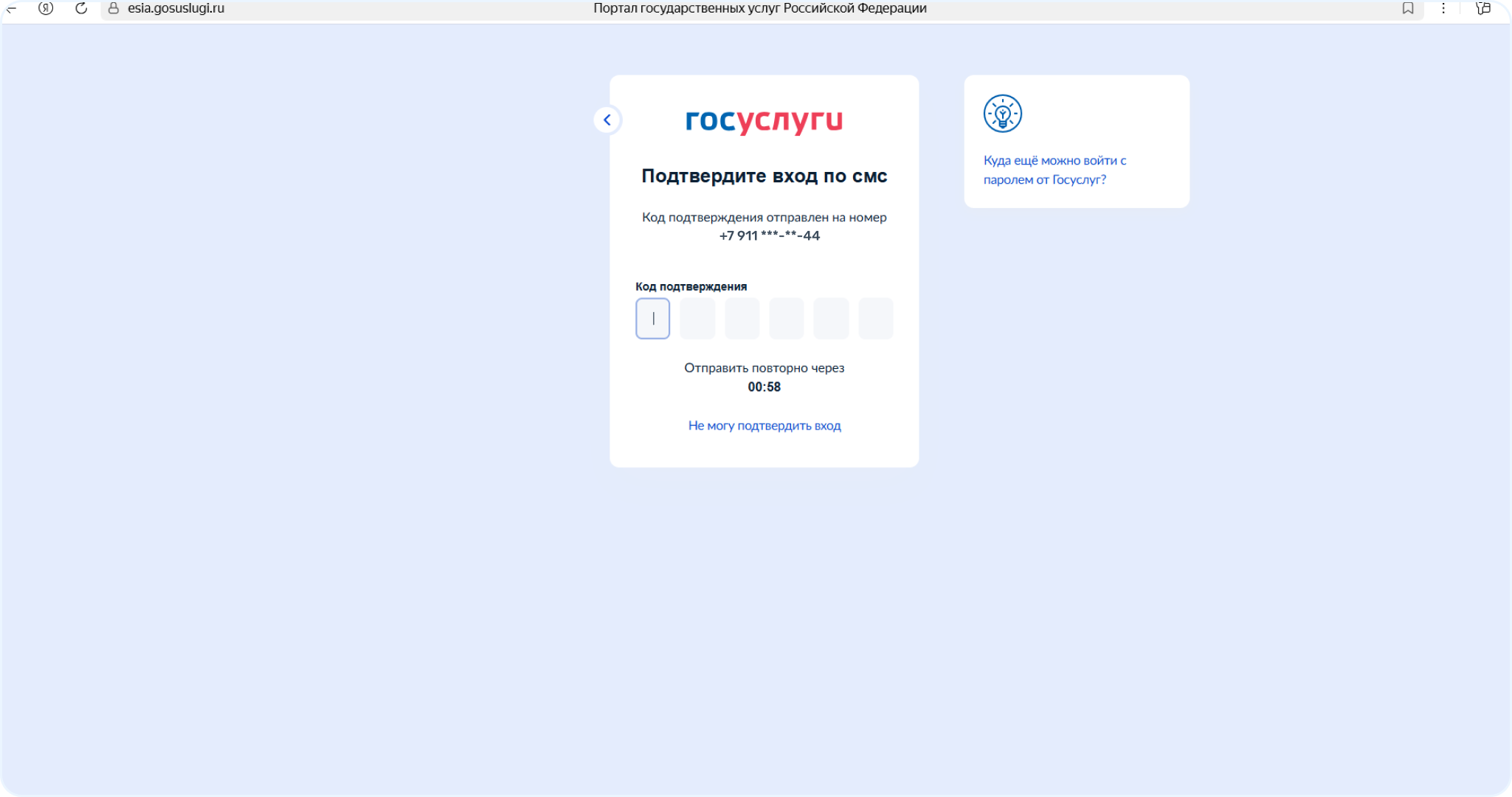 - Введите номер телефона, затем проверочный код, который придет в СМС.