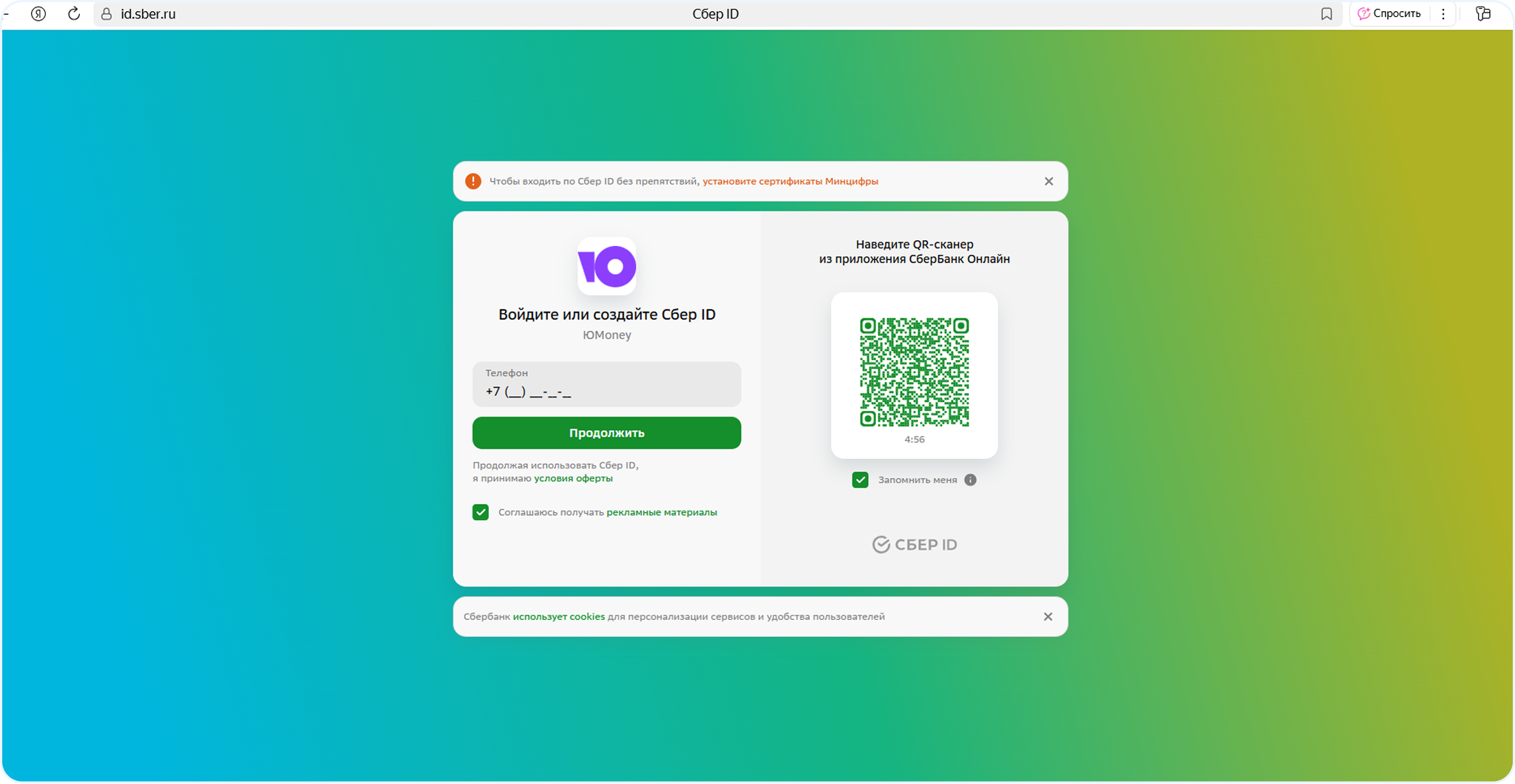Чтобы войти в ЮMoney с помощью единого аккаунта для всех сервисов Сбера и его партнеров: