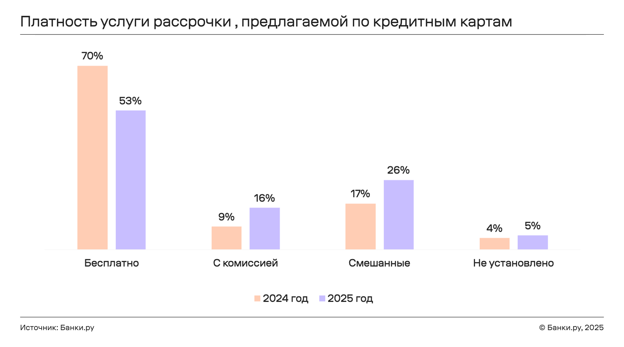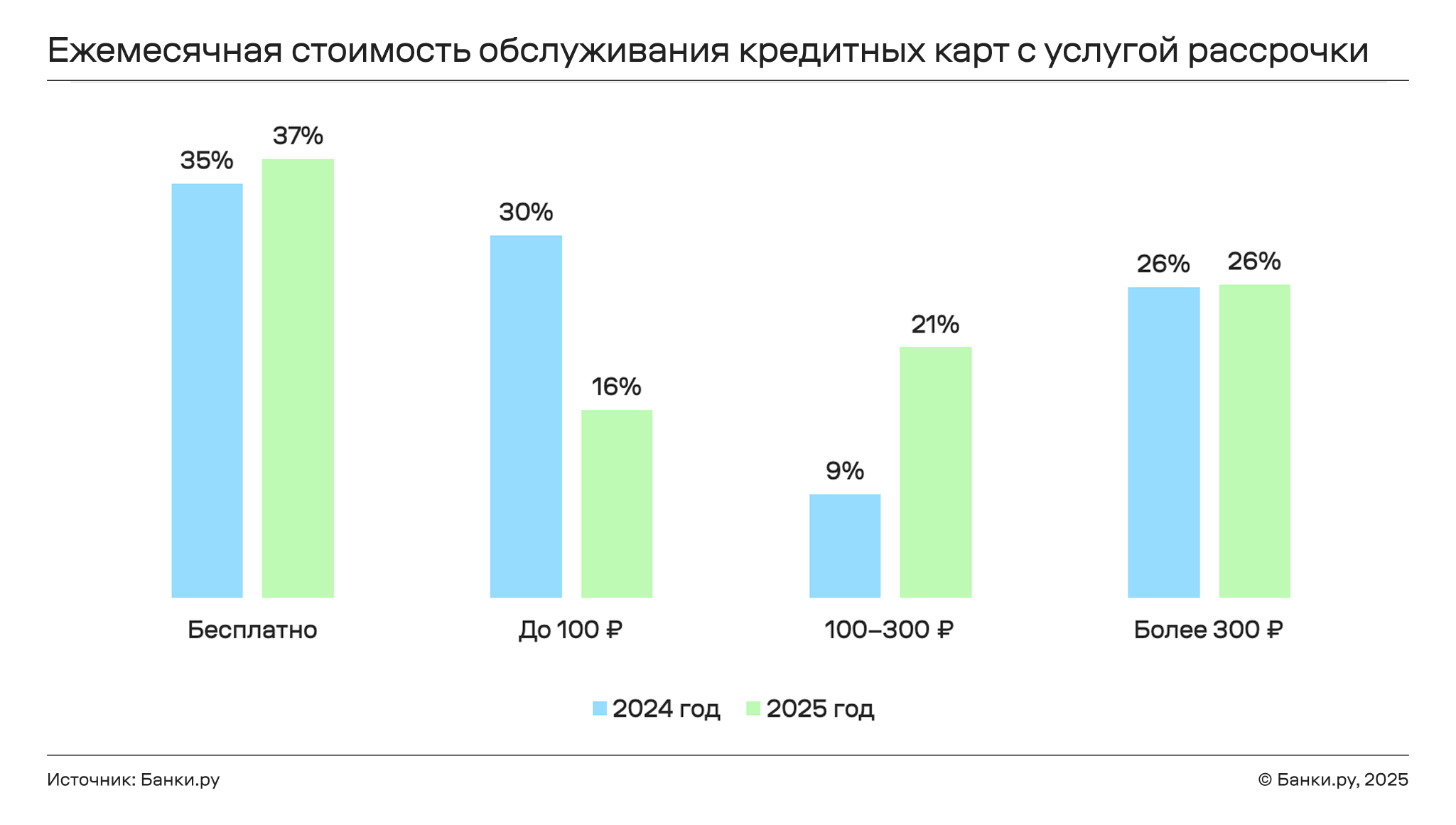 Чаще всего (70% случаев в 2024 году и 53% в 2025 году) услугой рассрочки держатель кредитной карты мог воспользоваться бесплатно. 16% карт в 2025 году и 9% в 2024 году предлагали эту услугу за плату (фиксированную либо в размере определенной доли от суммы покупки). По 26% продуктов в 2025 году и 17% в 2024 году была доступна рассрочка со смешанными условиями: например, бесплатная до определенного срока или на определенные покупки, но платная при несоблюдении этих условий.
