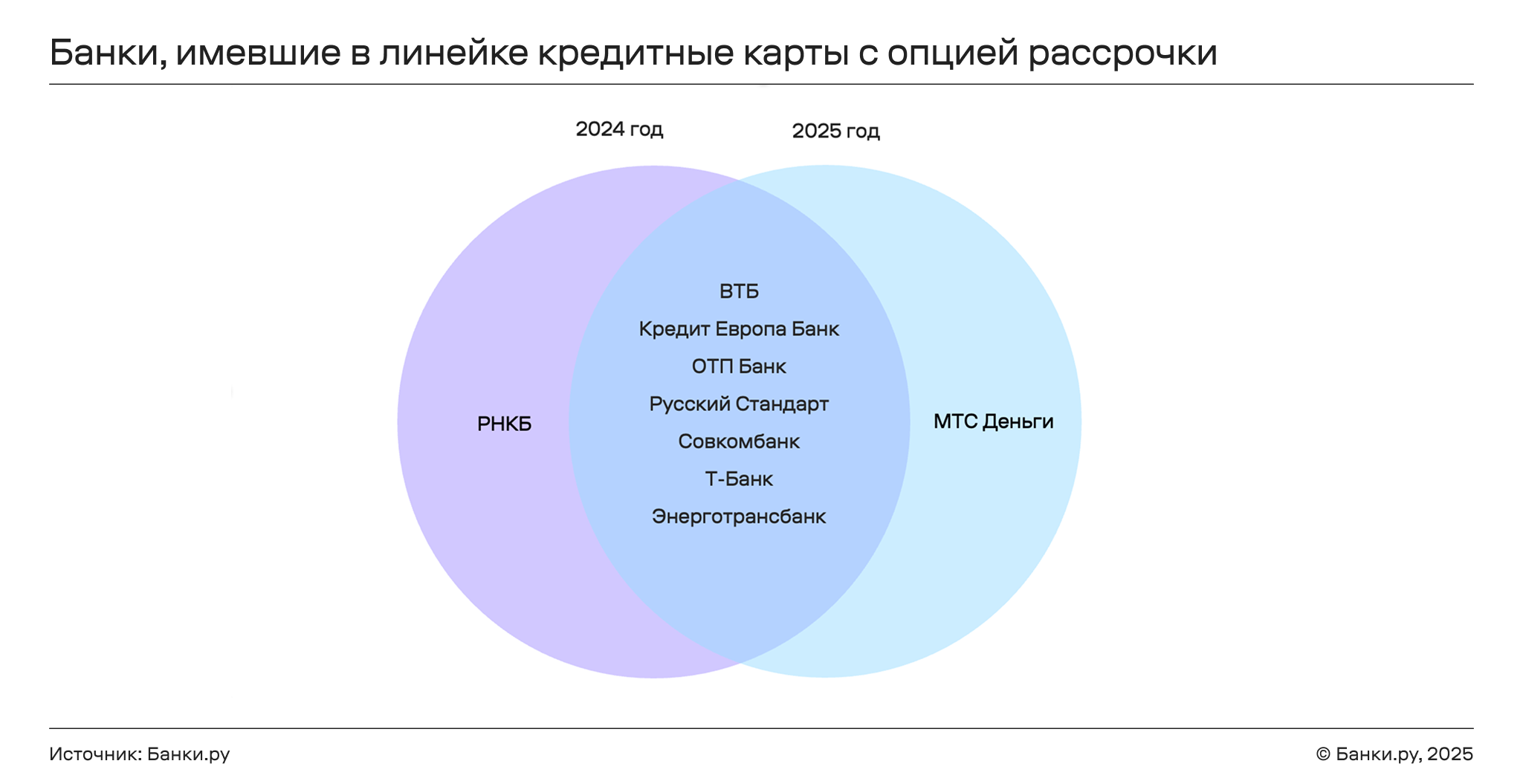 Состав банков, которые в 2025 году предлагают кредитные карты с опцией рассрочки, практически не изменился за год: из системно значимых в него вошли ВТБ, Совкомбанк и Т-Банк. В 2025 из перечня банков, предлагавших такие карты, исключен РНКБ (в связи с присоединением к ВТБ), но такой продукт появился у «МТС Деньги» (ЭКСИ-Банка).