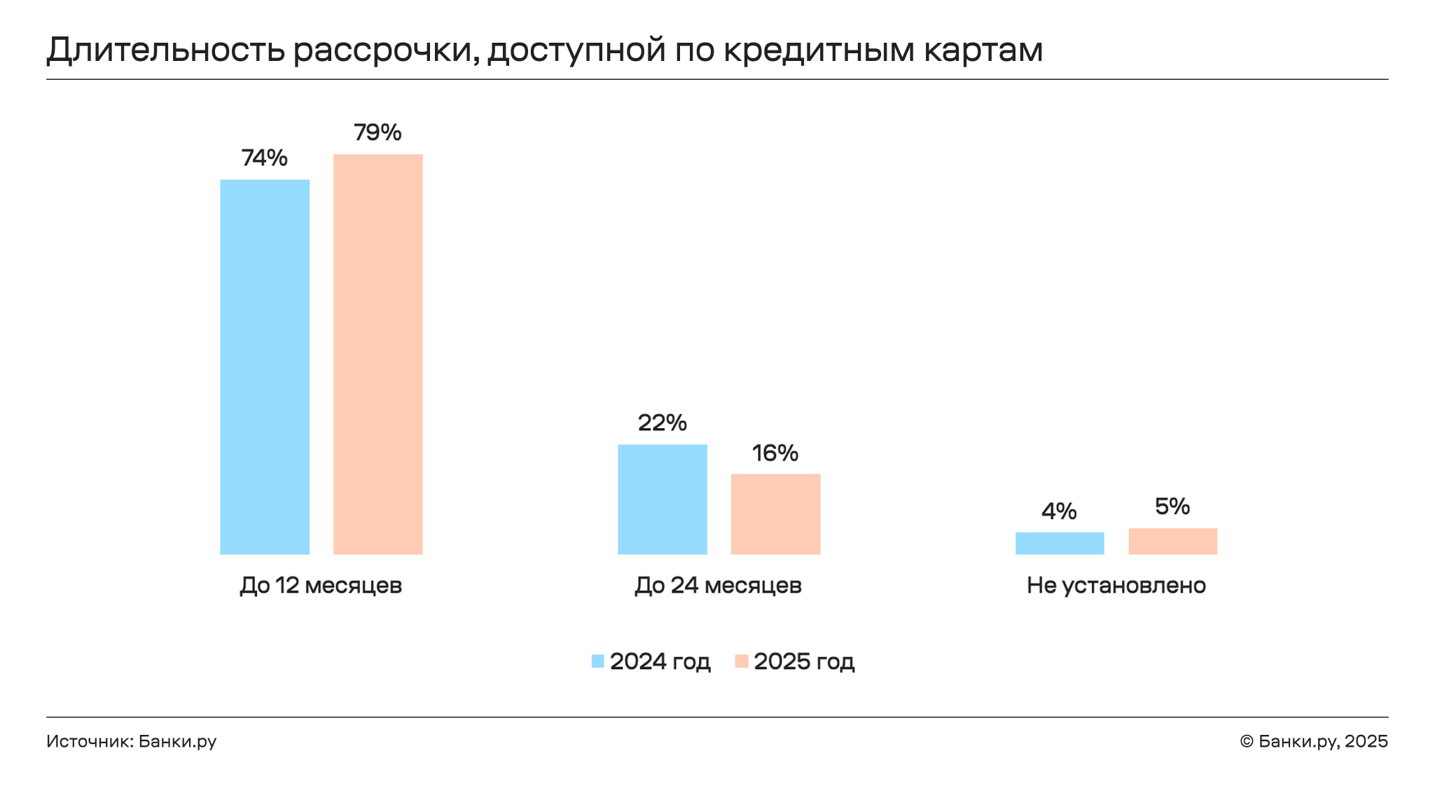 В подавляющем большинстве случаев (79% в 2025 году и 74% в 2025 году) держателям кредитных карт была доступна рассрочка на срок до 12 месяцев. Еще 16% предлагали рассрочку на срок до двух лет. При этом существуют и различные комбинированные варианты: например, на срок до 12 месяцев рассрочка может предоставляться бесплатно, а на срок 12–24 месяцев — с взиманием комиссии.