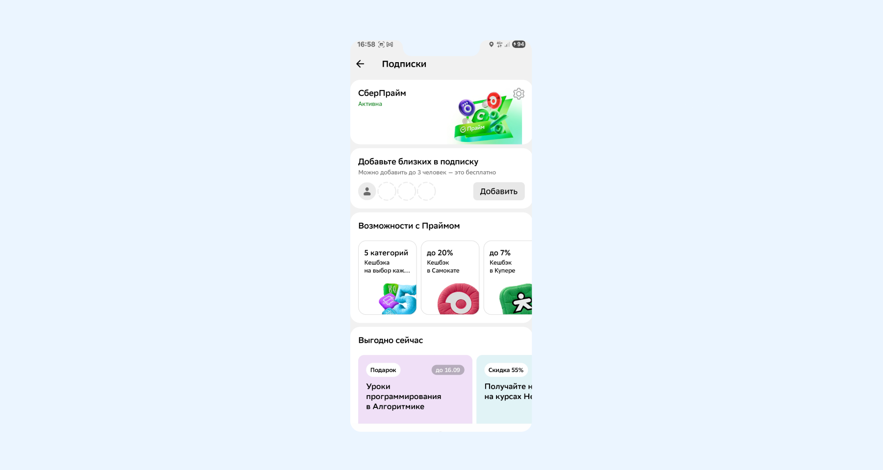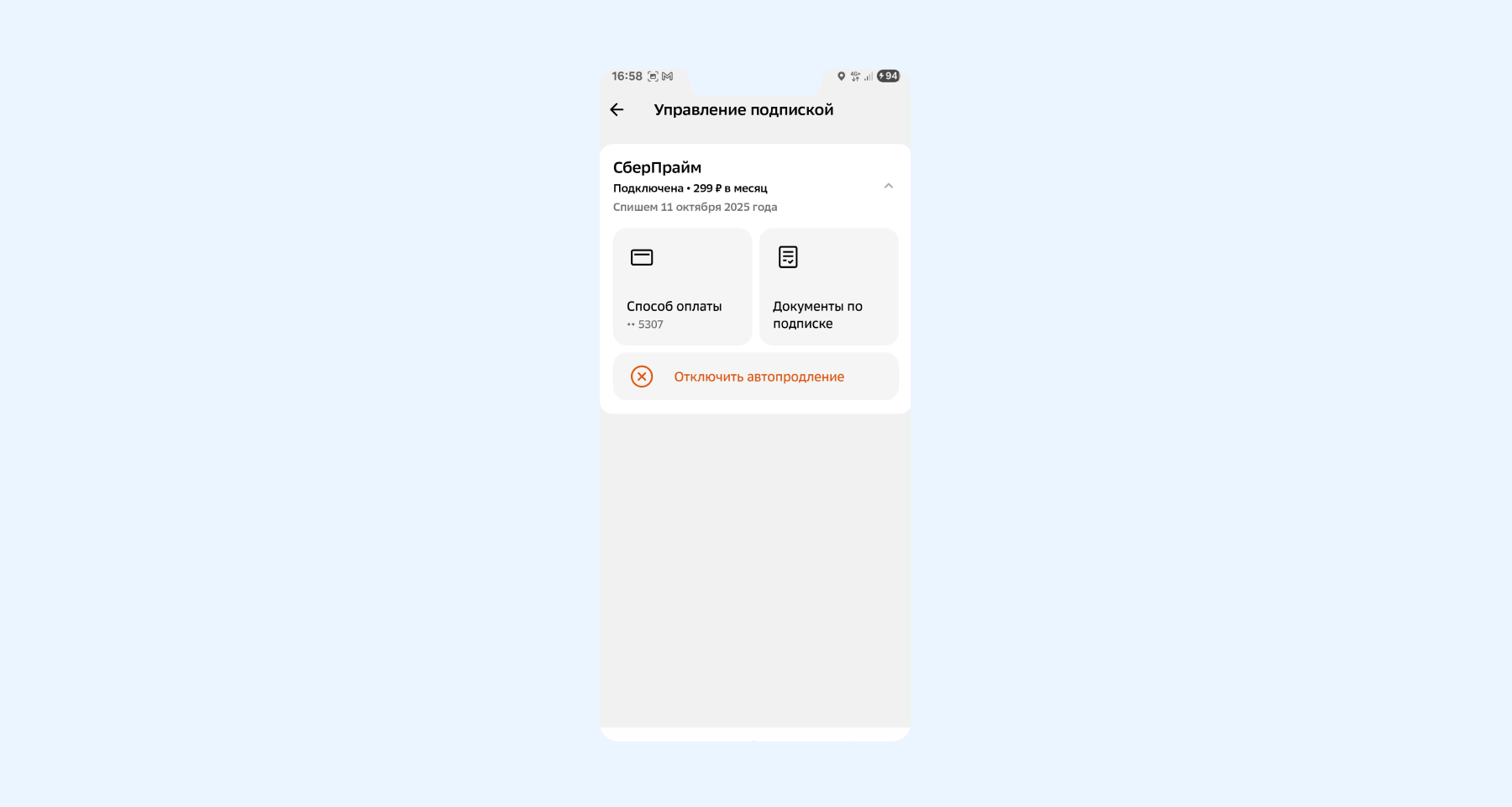 - Готово! Автопродление подписки «СберПрайм» выключено.