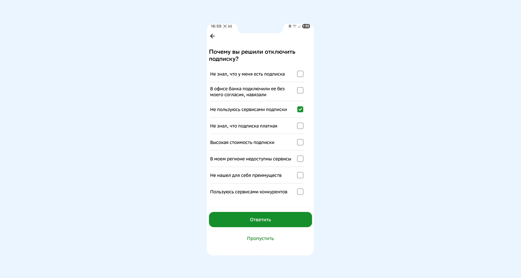 - Выберите причину отключения автопродления («Не знал, что у меня есть подписка», «В офисе банка подключили ее без моего согласия, навязали», «Не знал, что подписка платная» и т. д.).